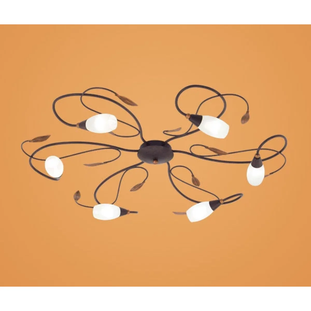 Oprawa sufitowa z serii GERBERA 1 wykonana jest ze stali w kolorze antycznego brązu i złota oraz białego satynowanego szkła. Wyposażony jest w sześć żarówek halogenowych G9.