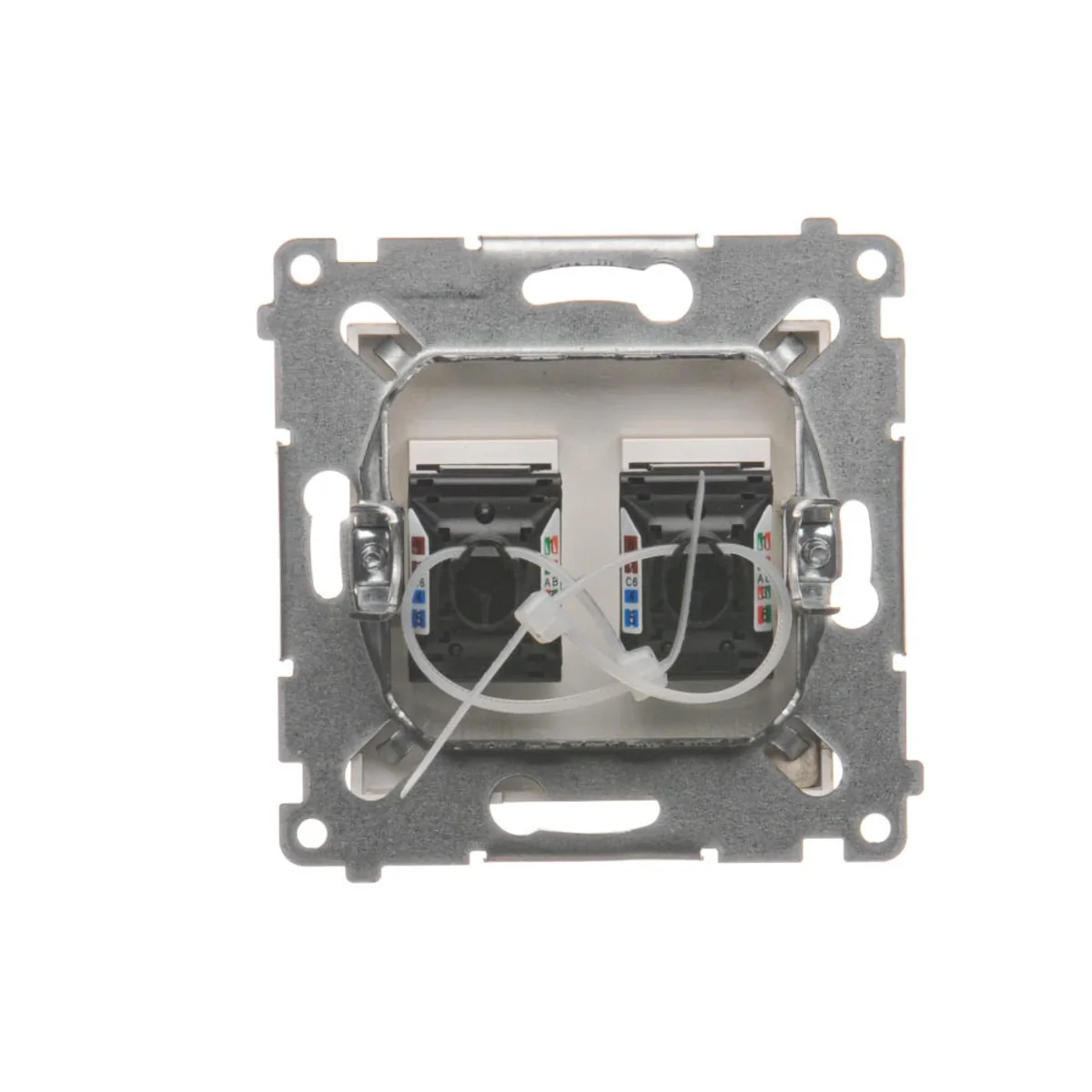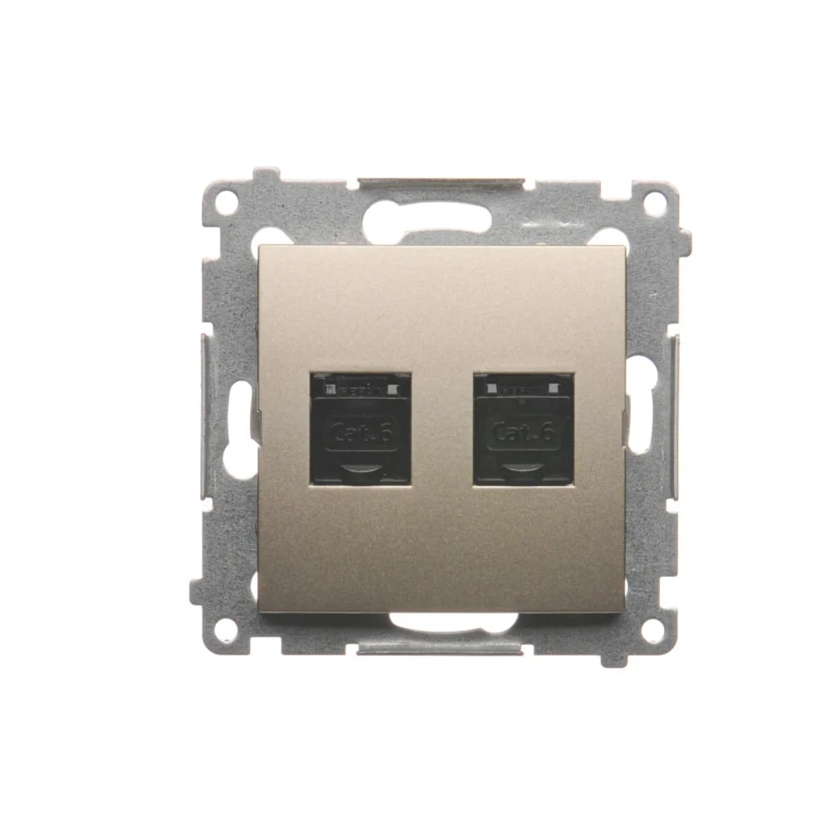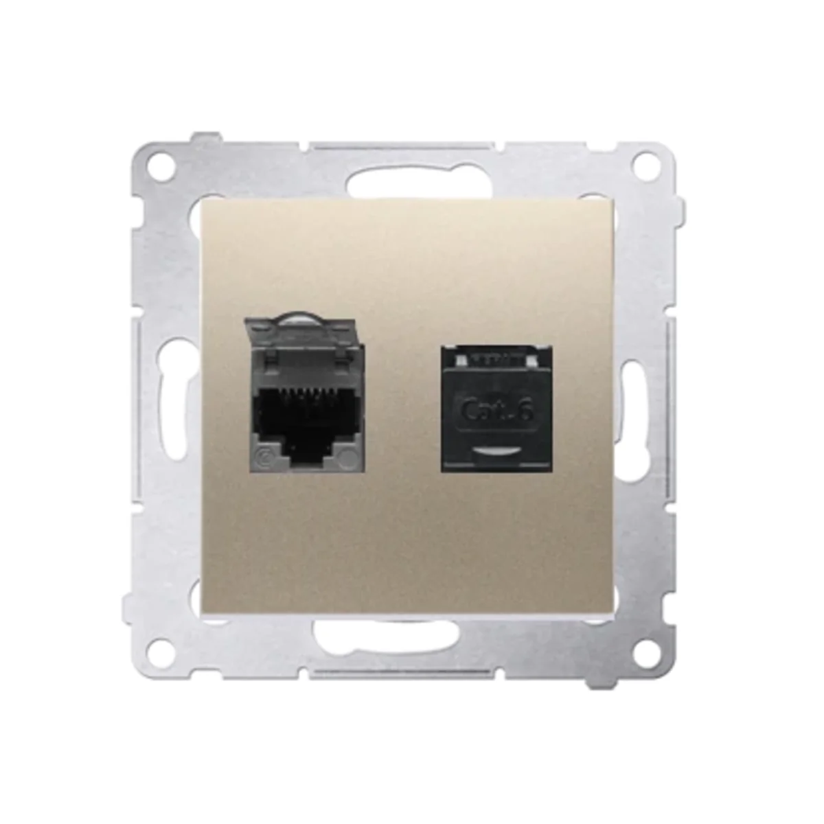 Gniazdo komputerowe podwójne RJ45 kategoria 6, z przesłoną przeciwkurzową, z serii SIMON 54. Wykonane z tworzywa sztucznego. Z zaciskiem przebijającym izolację.