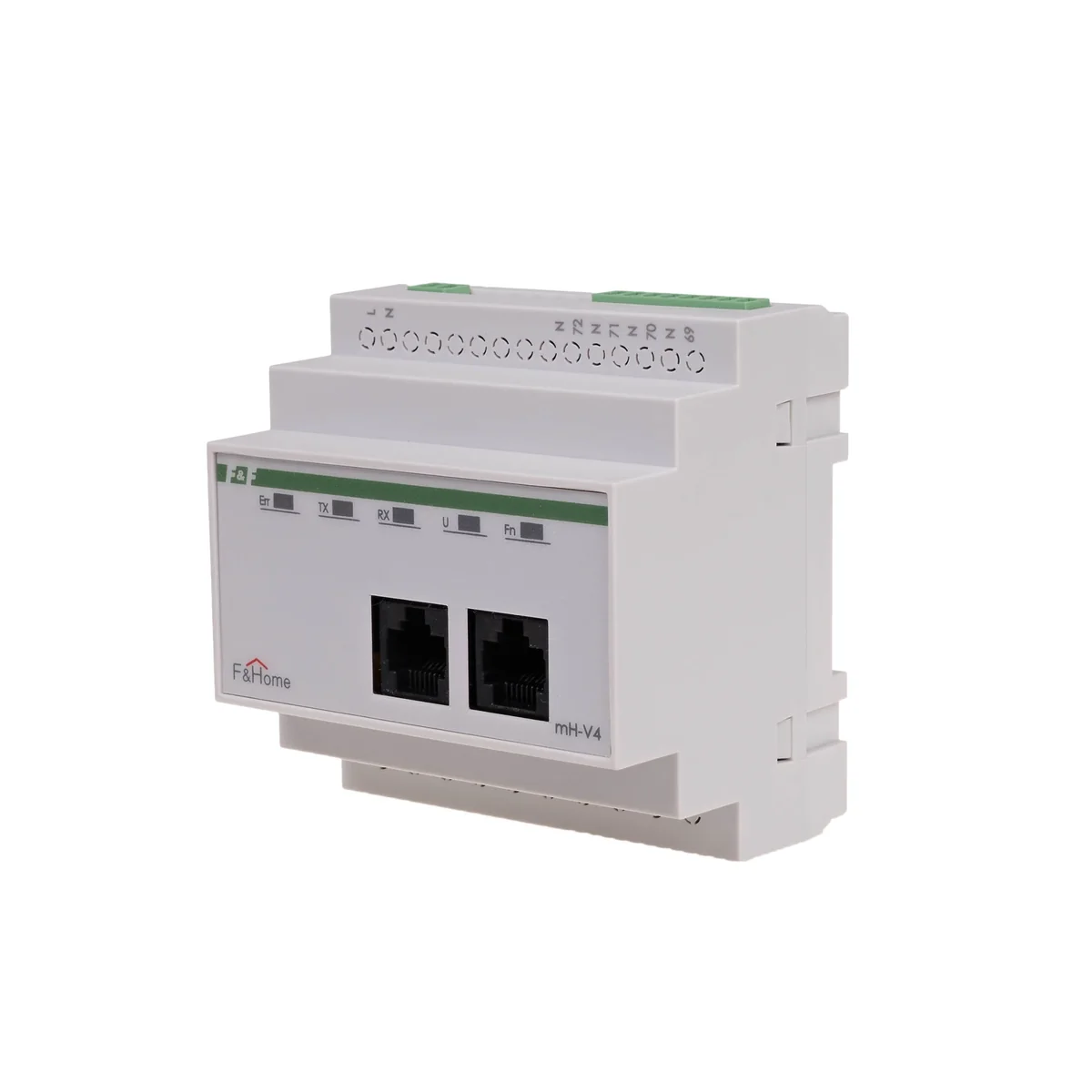 Moduł mH-V4 jest czterokanałowym modułem wykonawczym sterującym pracą elektrozaworów podłączonych do wyjść modułu i przystosowany jest do pracy z modułami czujników temperatury mH-S4. Moduł montowany jest w rozdzielni i zajmuje pole 5 modułów, a napięcie zasilania modułu wynosi 230VAC. Moduł nadaje się do sterowania elektrozaworami w obwodach ogrzewania (zazwyczaj zainstalowanymi na kolektorze) o napięciu cewki 230VAC i działa na zasadzie włącz-wyłącz, niezależnie od głównego panelu dotykowego (stanowi autonomiczną parę z modułem mH-S4 znajdującego się na tym samym poziomie). W przypadku potrzeby stosowania podłączenia większej ilości czujników temperatury można zastosować kilka modułów mH-V4, przy czym należy pamiętać że muszą to być moduły kolejnych poziomów (mH-V4 – poziom 1, mH-V4-poziom 2…).