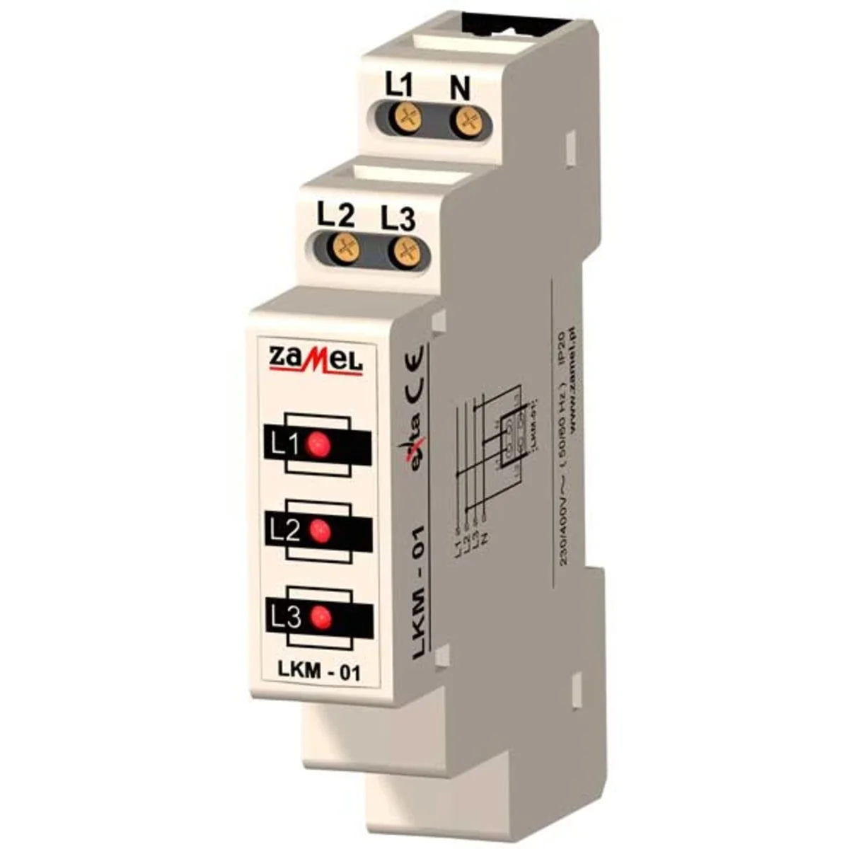 Wskaźnik zasilania LKM-01-10 służy do sygnalizacji napięcia w sieci trójfazowej. Sygnalizacja realizowana jest przy pomocy trzech diod LED oznaczonych L1, L2, L3. Dostępne są cztery wersje kolorystyczne diod LED (czerwona). Wskaźnik zasilania LKM-01-10 może być zastosowany w sieci TNC (z punktem zerowym).