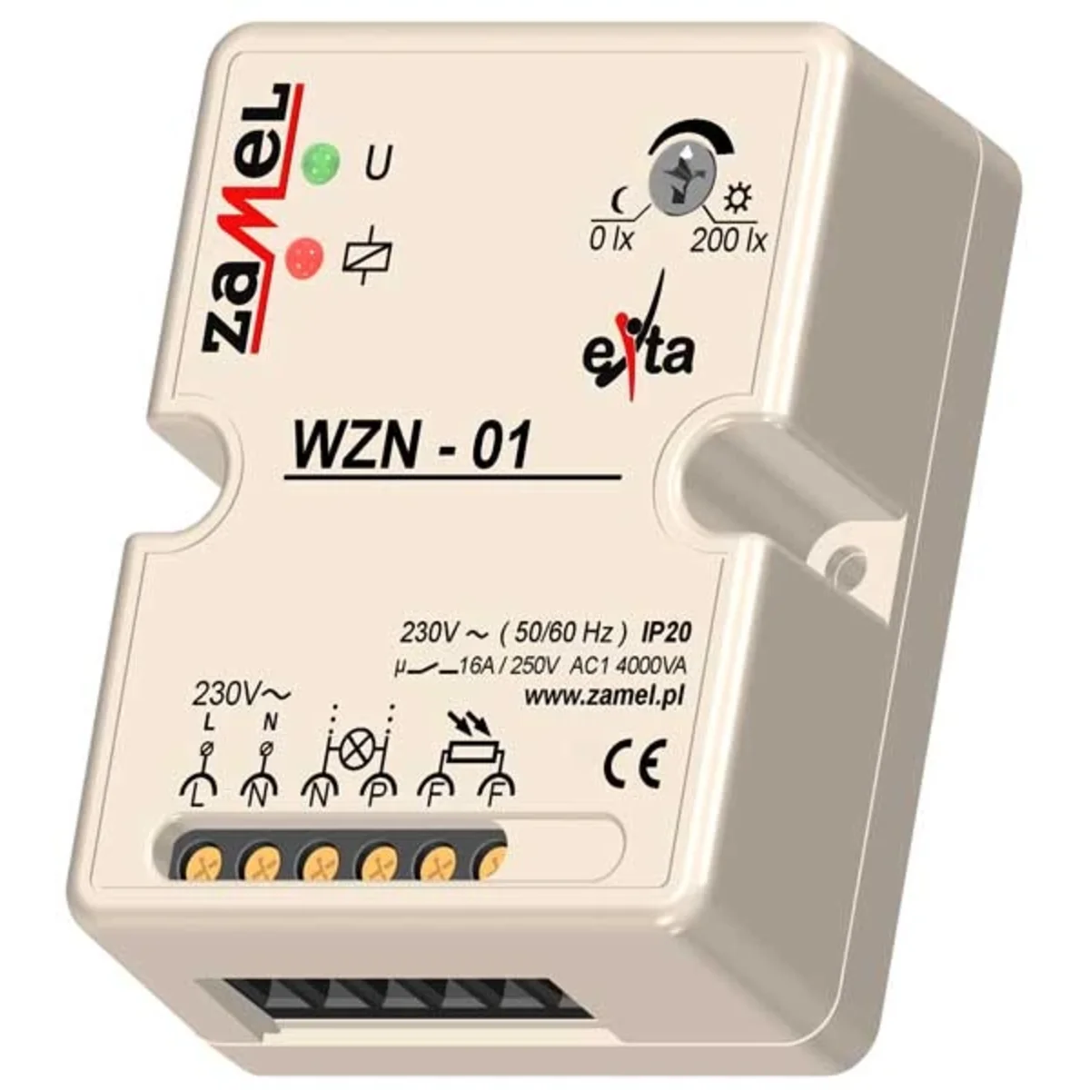 Wyłącznik zmierzchowy WZN-01 służy do sterowania urządzeniami oświetleniowymi lub innymi odbiornikami energii w zależności od natężenia oświetlenia - załącza oświetlenie o zmierzchu i wyłącza o świcie. Próg załączenia może być płynnie nastawiony przez użytkownika. Urządzenie jest odporne na krótkotrwałe zmiany natężenia oświetlenia co gwarantuje niezawodność pracy. Zewnętrzna sonda natężenia oświetlenia serii SOH z przewodem o maksymalnej długości 50 m umożliwia umieszczenie jej w dogodnych miejscach.