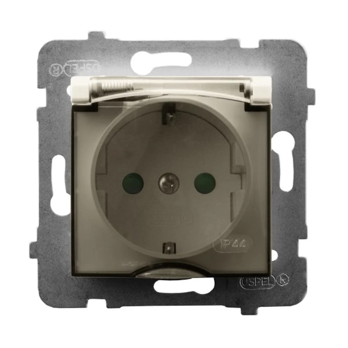 Gniazdo hermetyczne wyposażone w klapkę, z uziemieniem schuko, z przesłonami torów prądowych. Należy zastosować ramkę.
