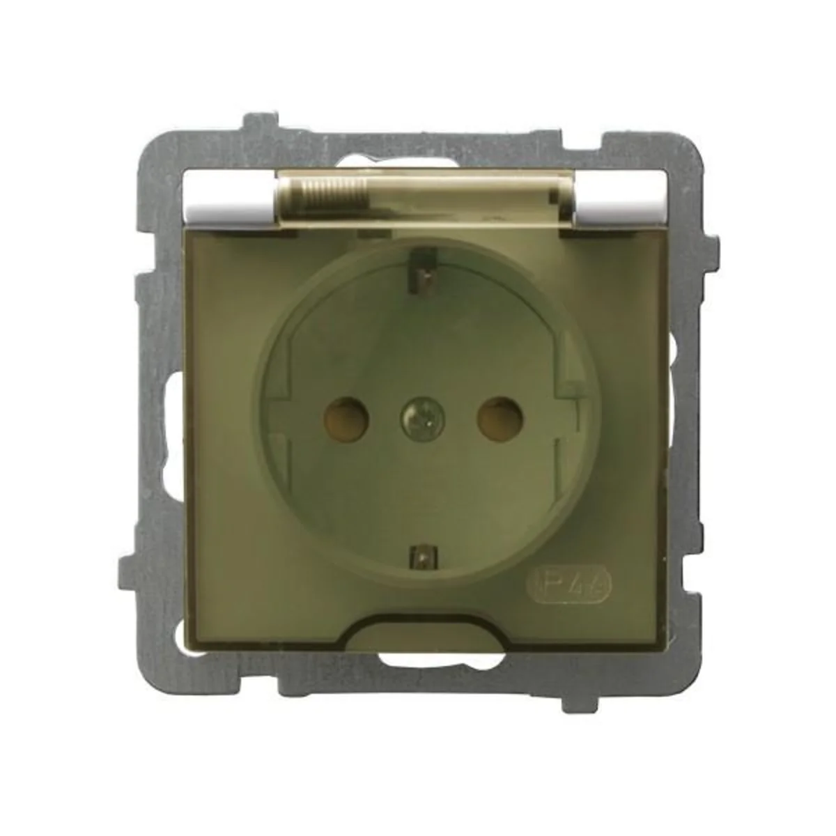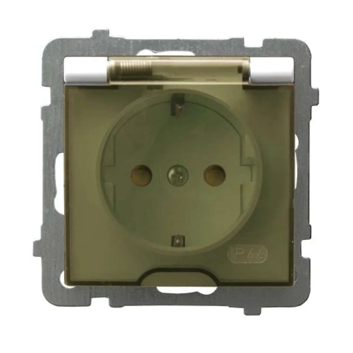 AS Gniazdo bryzgoszczelne z uziemieniem schuko IP44 z przesłonami torów prądowych klapka dymna ecru GPH-1GSP/M/27/D