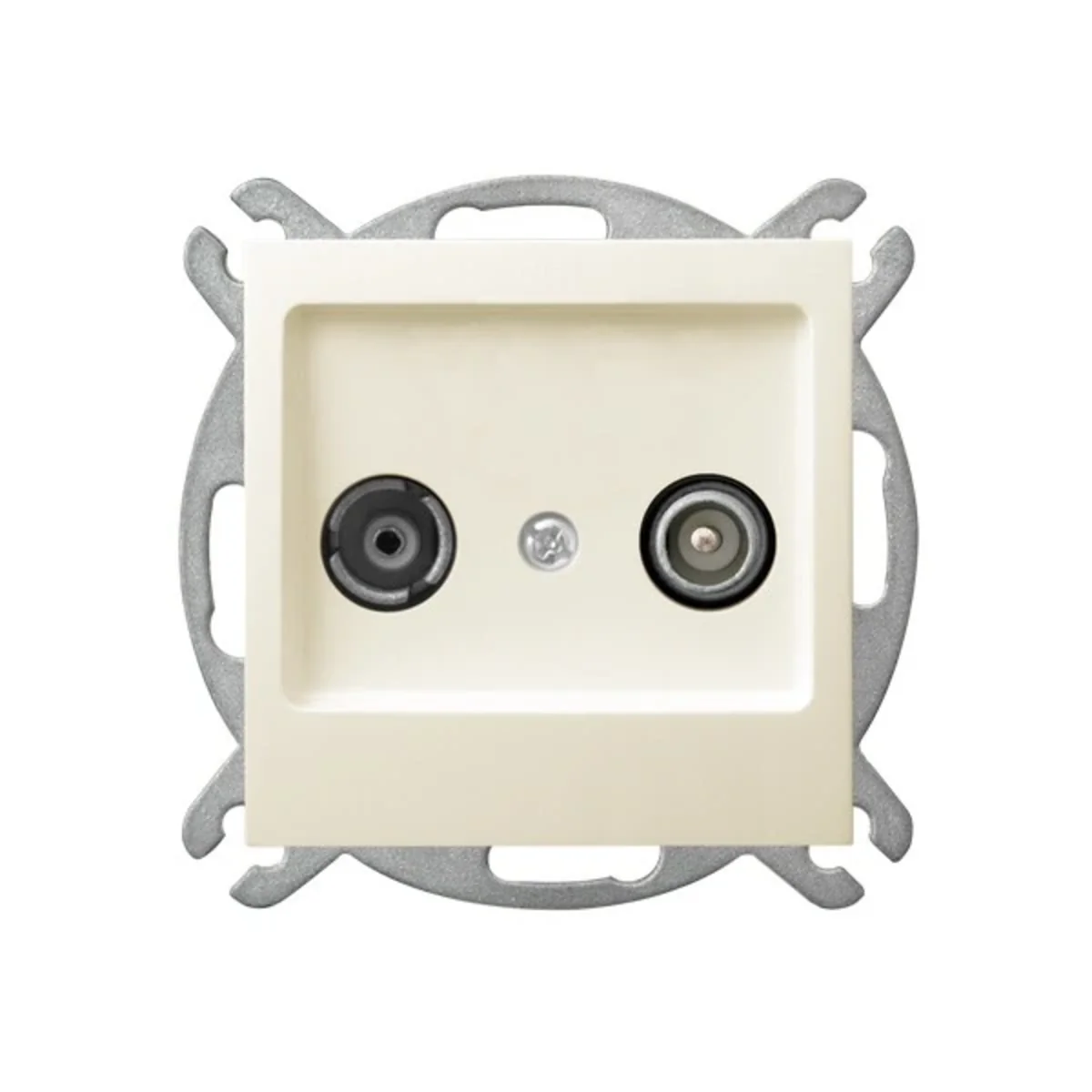Gniazdo antenowe RTV przelotowe. Jest przeznaczone do instalacji szeregowej, w której jeden kabel przechodzi przez różne odbiorniki. Do wyposażenia w ramkę.