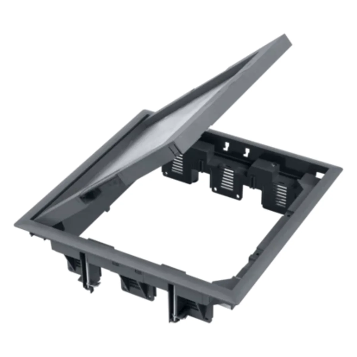Puszka podłogowa FB dedykowana jest głównie do dużych obiektów biurowych z pomieszczeniami typu "open space", w których występuje podłoga podniesiona (techniczna). Jej konstrukcja oraz funkcjonalne rozwiązania przygotowane są specjalnie z myślą o tego typu instalacjach. Cztery metalowe uchwyty montażowe (łapki) zapewniają pewny montaż w podłodze. Prowadnice do uchwytów montażowych gwarantują umieszczenie ich w odpowiednim położeniu podczas montażu. Puszka pomieści 12 modułów K45 lub po zastosowaniu dedykowanych ramek osprzętowych - 6 modułów SIMON 500. W tym przypadku możliwy jest dodatkowy montaż aż 3 modułów K45/2 22,5x45 mm. Puszka charakteryzuje się regulowaną głębokością: 85-116 mm. Pokrywa puszki umożliwia wykończenie puszki materiałem podłogi o grubości 12 mm (np. płytki podłogowe, parkiet, kamień). UWAGA: Do montażu osprzętu należy zastosować 3 ramki osprzętowe FBA40x.