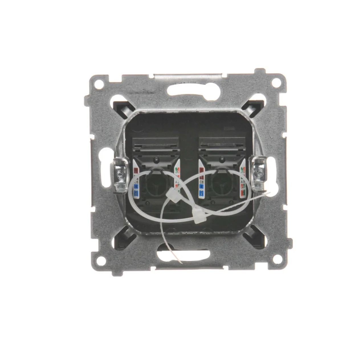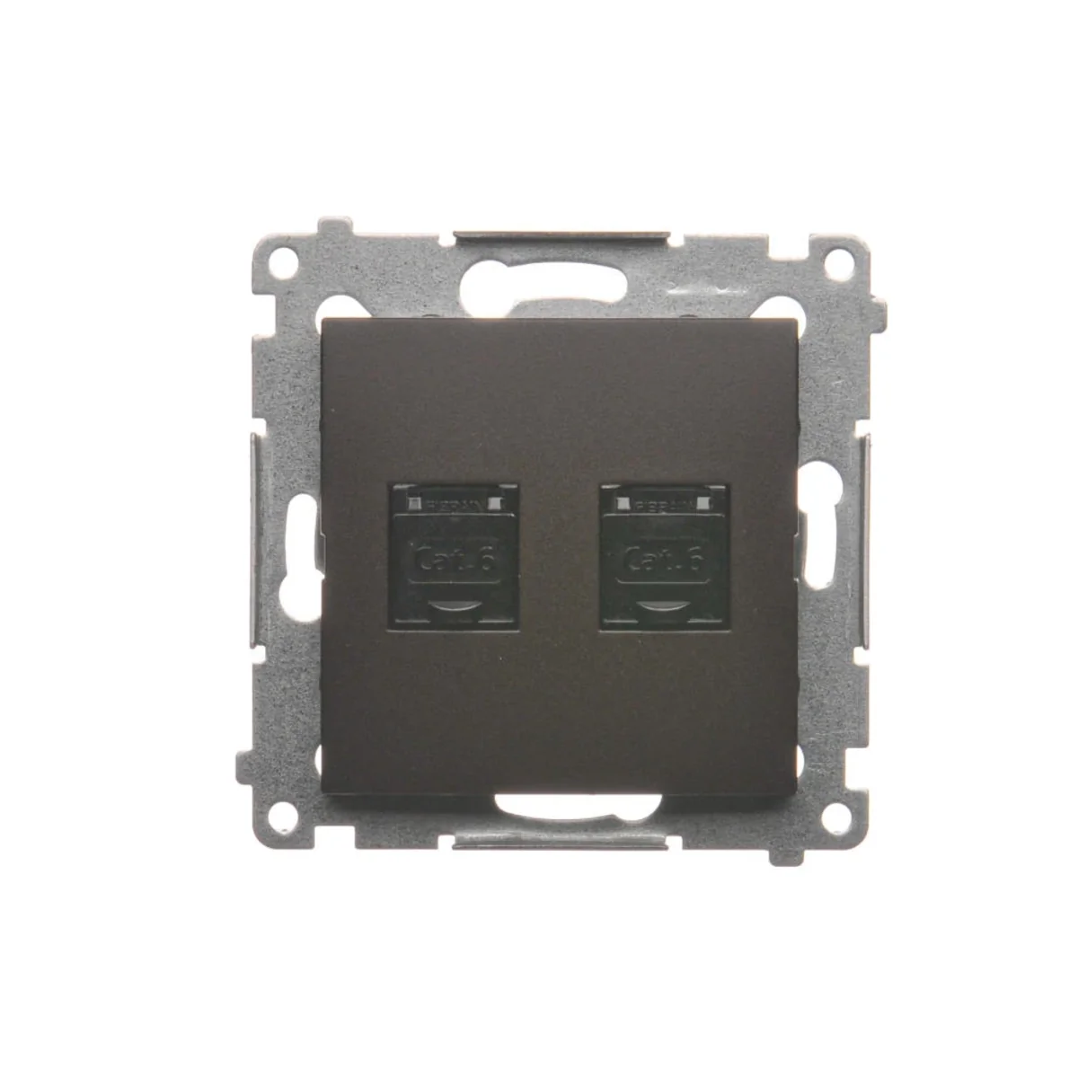 Gniazdo komputerowe podwójne RJ45 kategoria 6, z przesłoną przeciwkurzową, z serii SIMON 54. Wykonane z tworzywa sztucznego. Z zaciskiem przebijającym izolację.