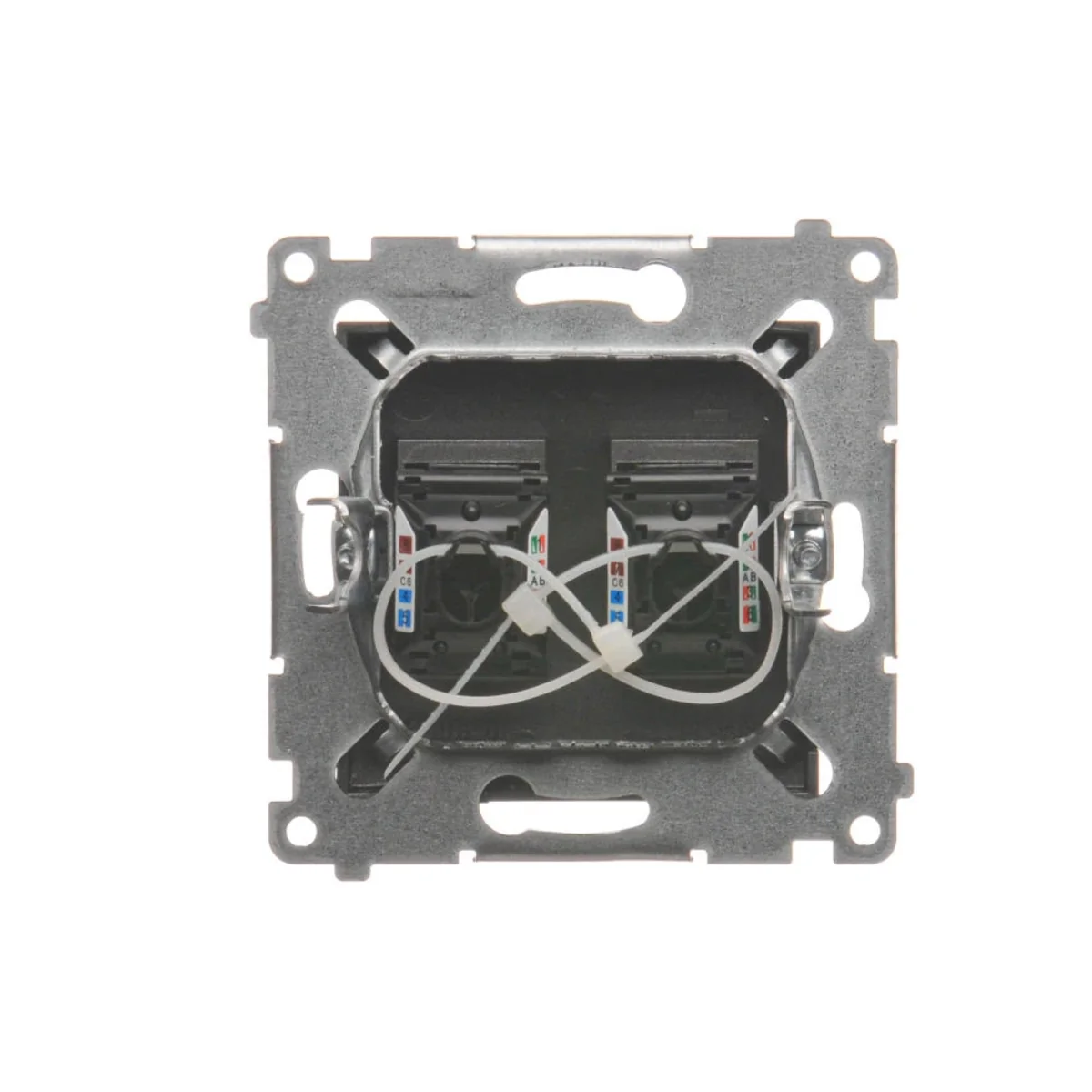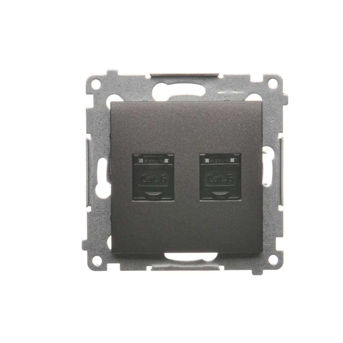 Gniazdo komputerowe podwójne RJ45 kategoria 6, z przesłoną przeciwkurzową, z serii SIMON 54. Wykonane z tworzywa sztucznego. Z zaciskiem przebijającym izolację.