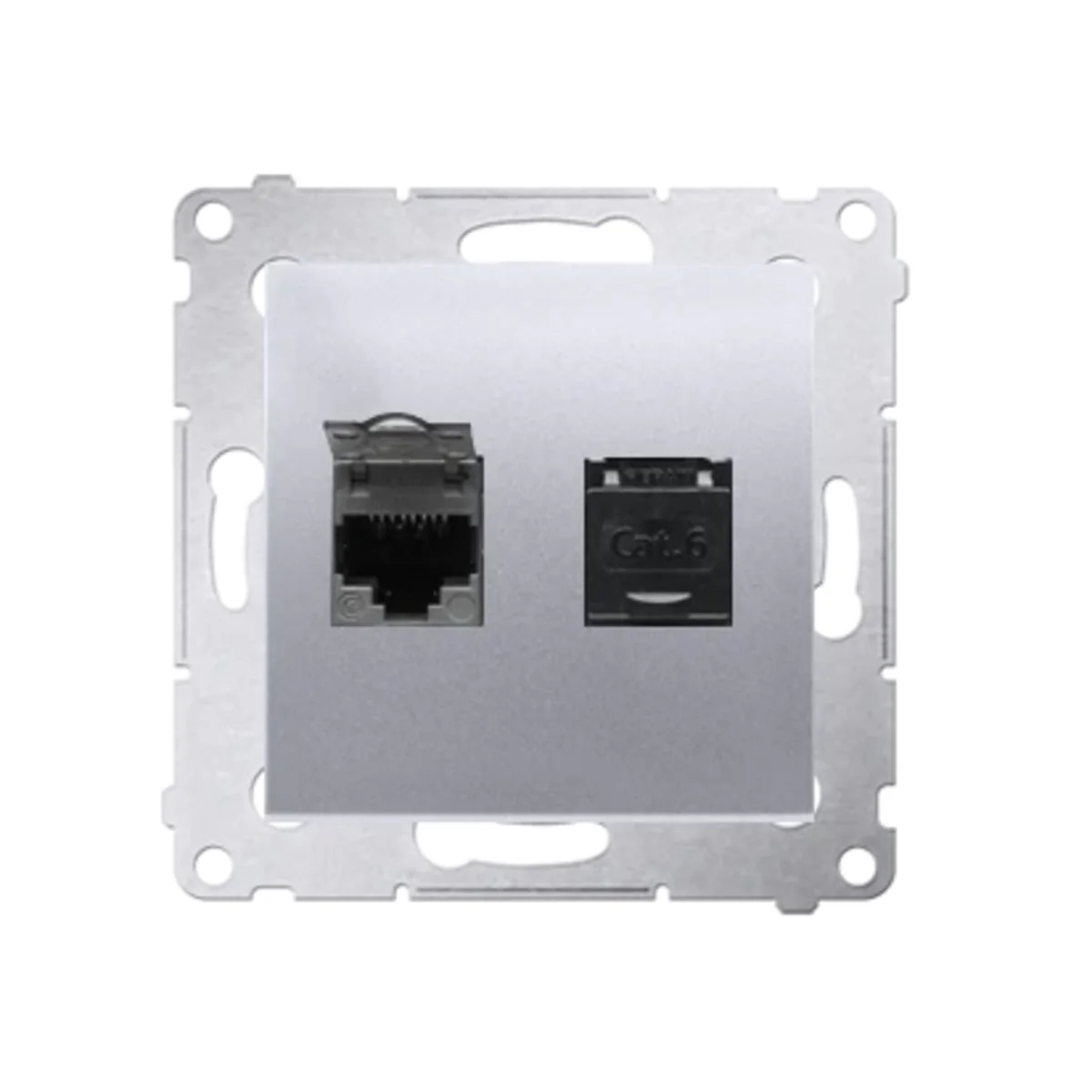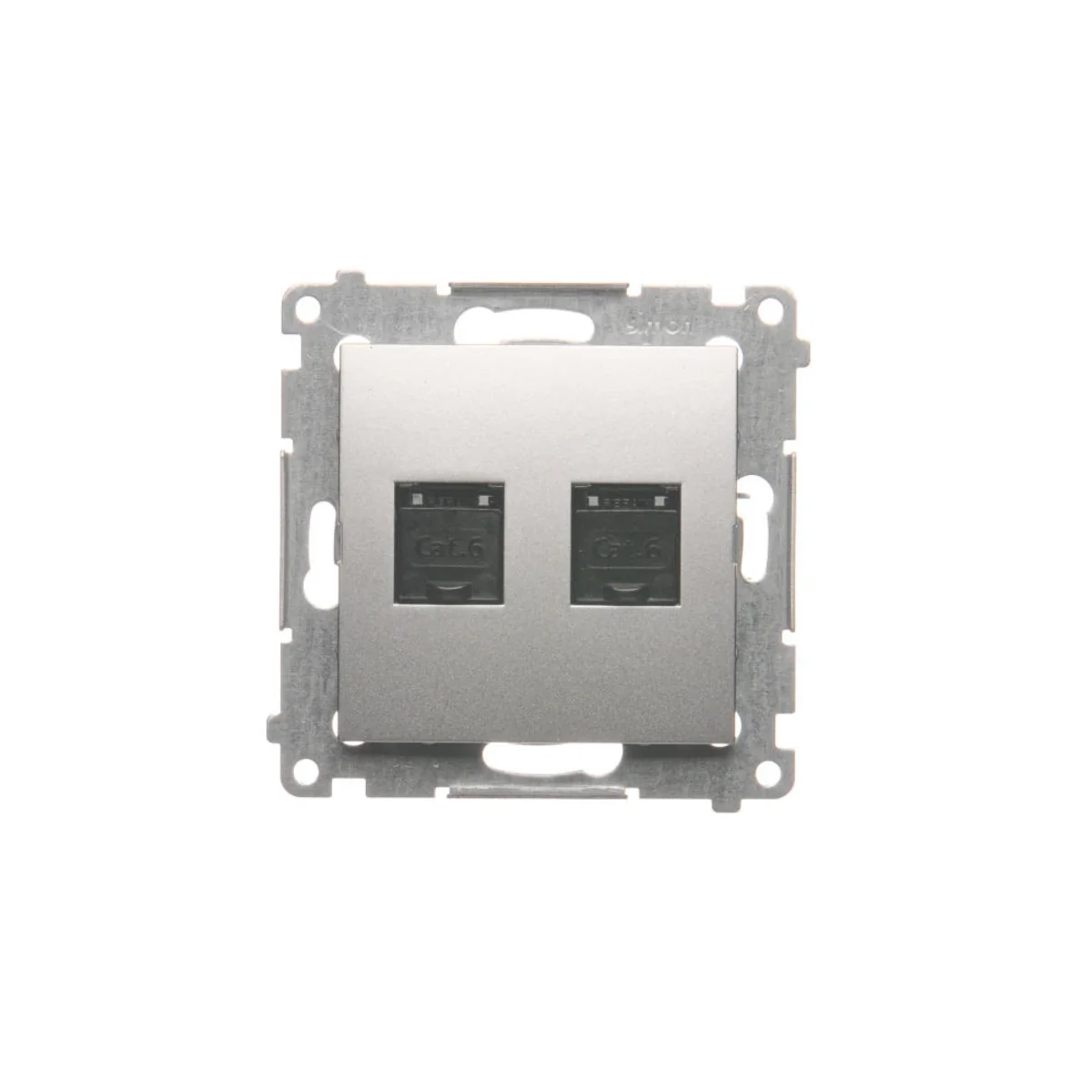 Gniazdo komputerowe podwójne RJ45 kategoria 6, z przesłoną przeciwkurzową, z serii SIMON 54. Wykonane z tworzywa sztucznego. Z zaciskiem przebijającym izolację.