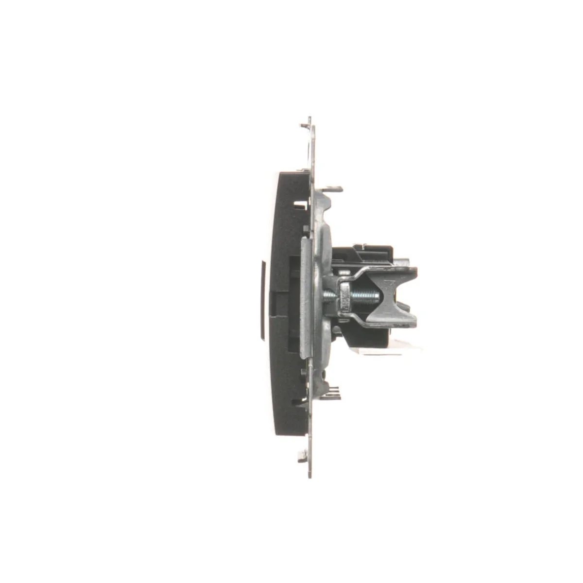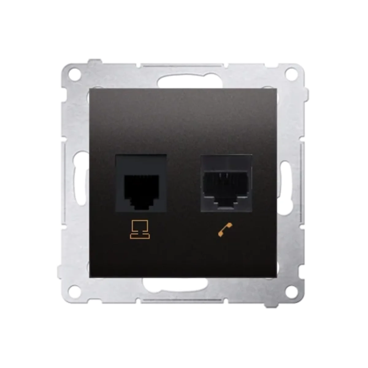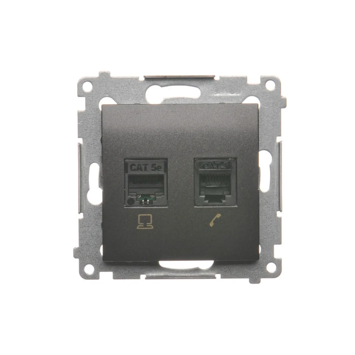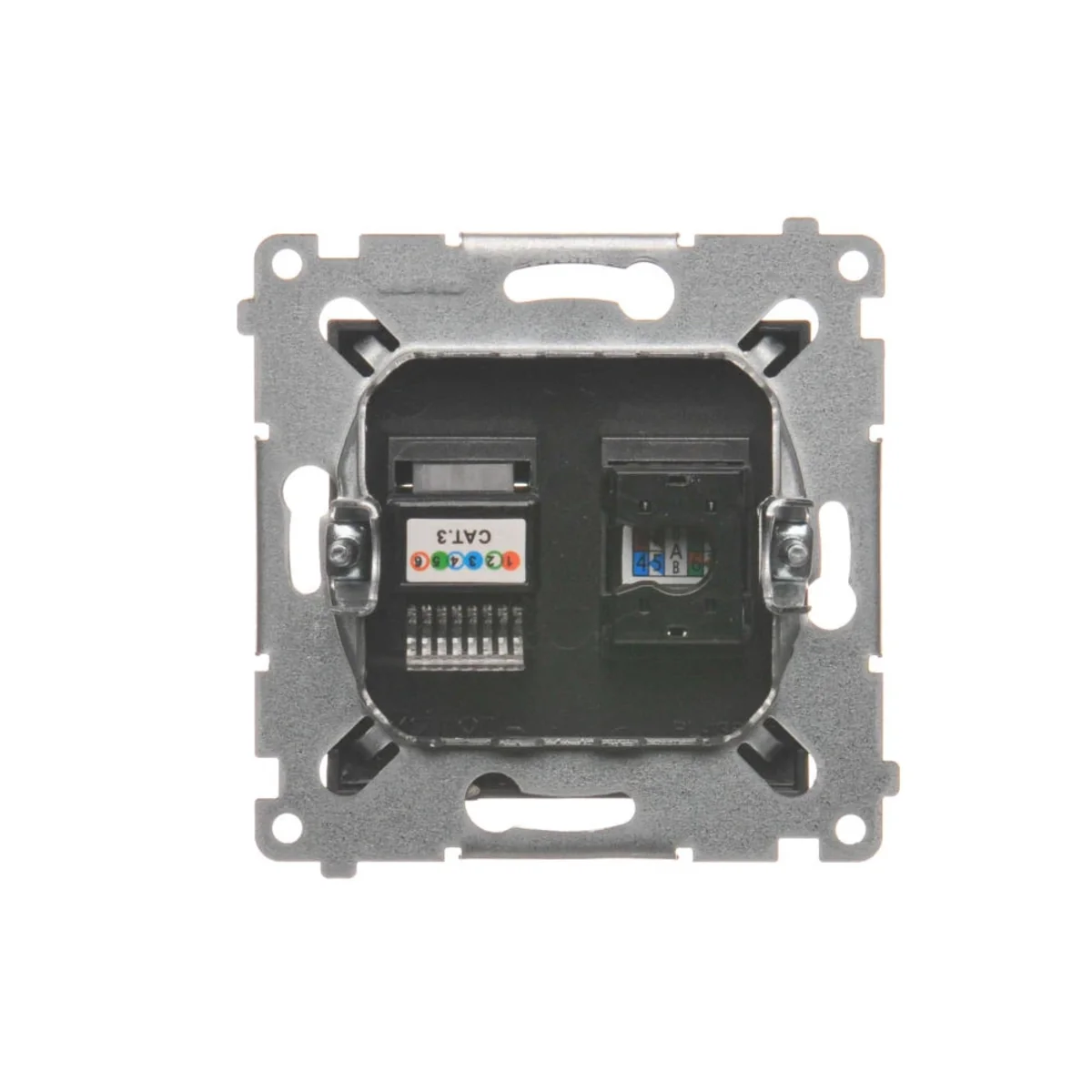 Gniazdo komputerowe RJ45 kategoria 5e + telefoniczne RJ12, z serii SIMON 54. Wykonane z tworzywa sztucznego. Z zaciskiem przebijającym izolację.