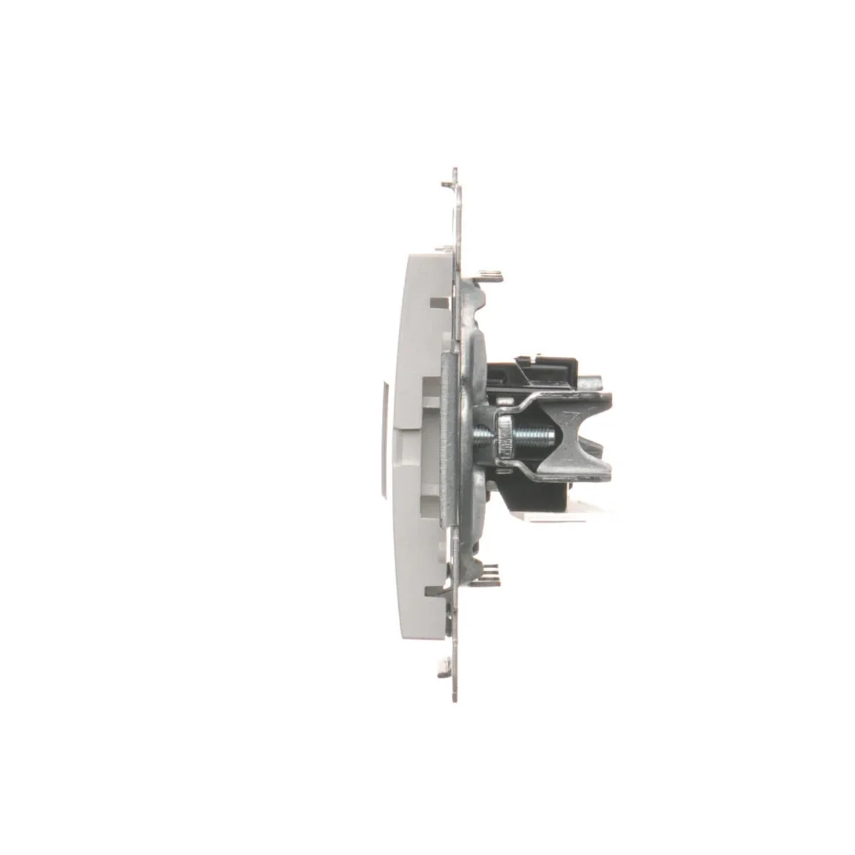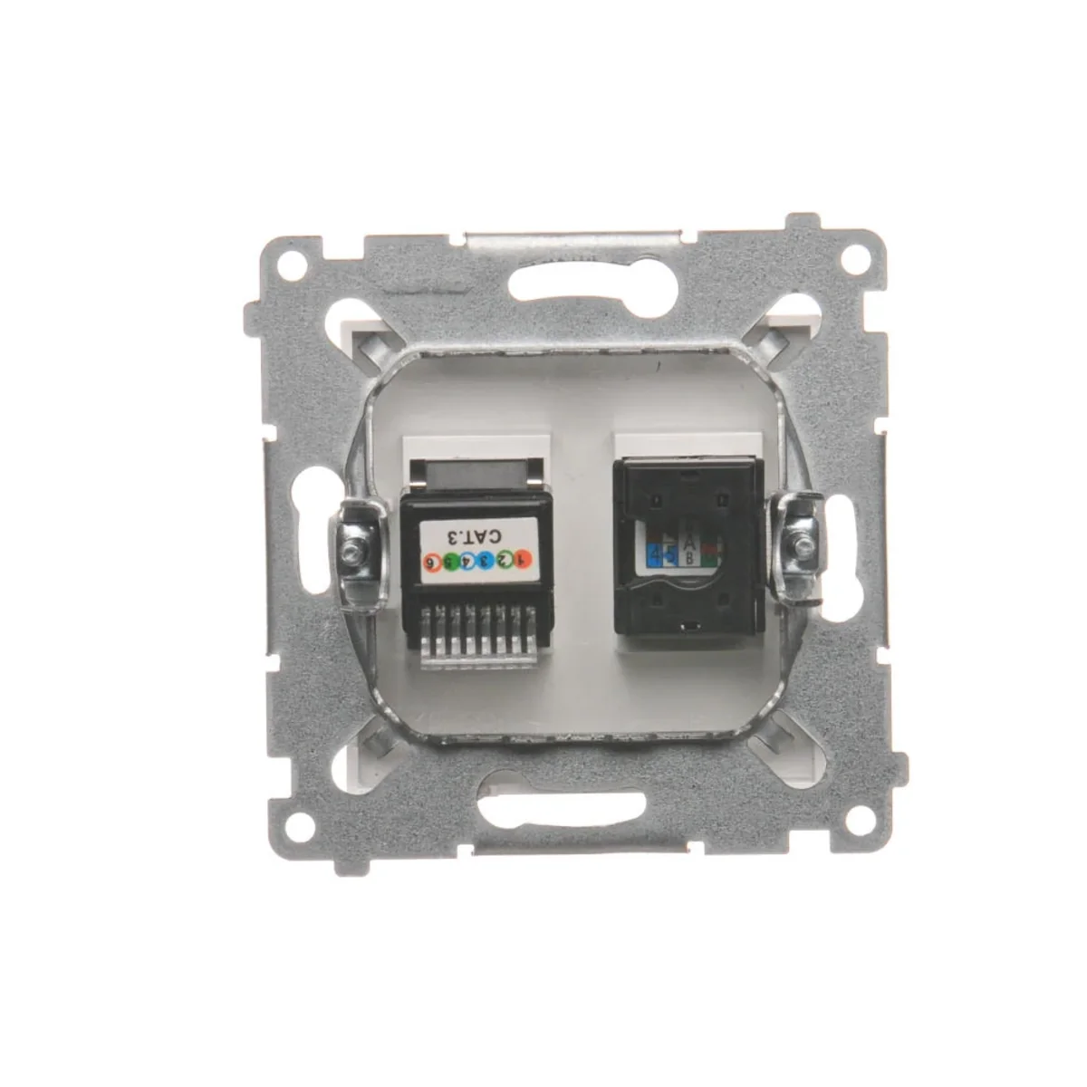 Gniazdo komputerowe RJ45 kategoria 5e + telefoniczne RJ12, z serii SIMON 54. Wykonane z tworzywa sztucznego. Z zaciskiem przebijającym izolację.