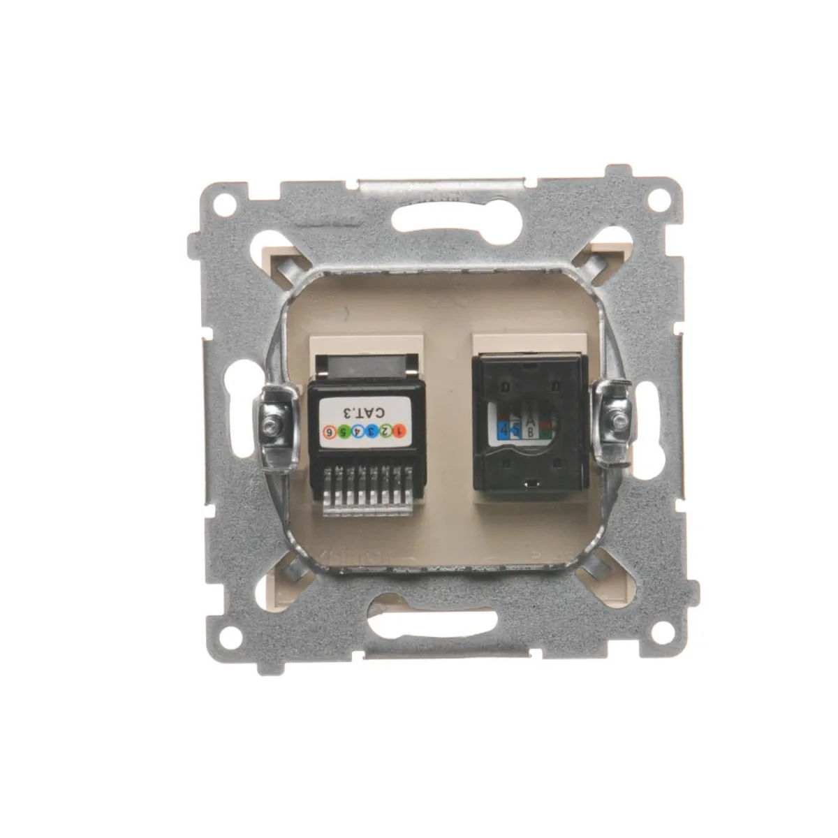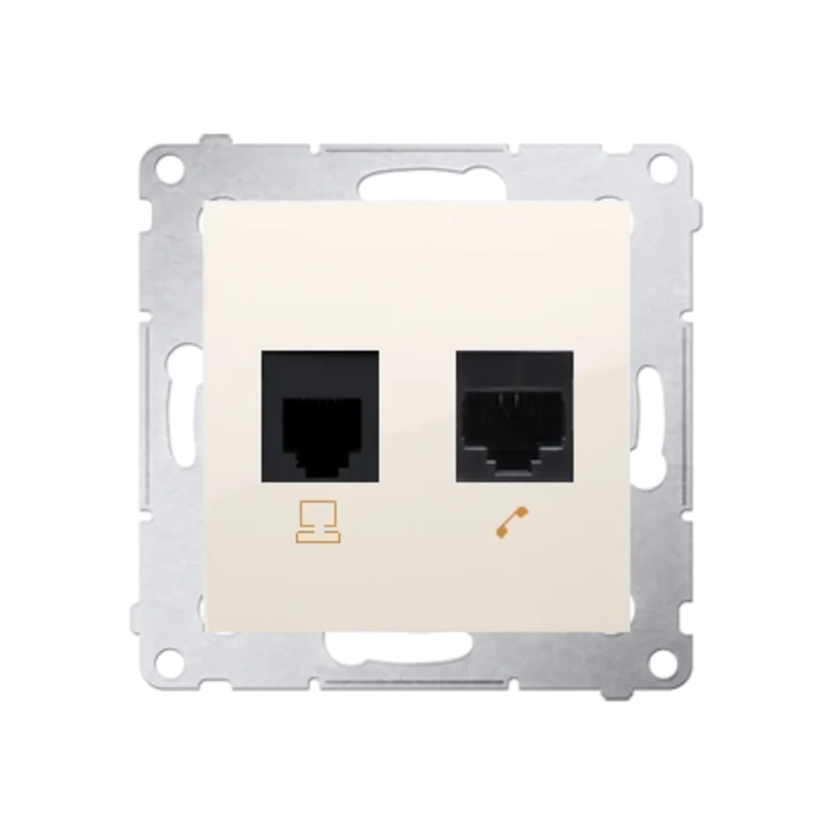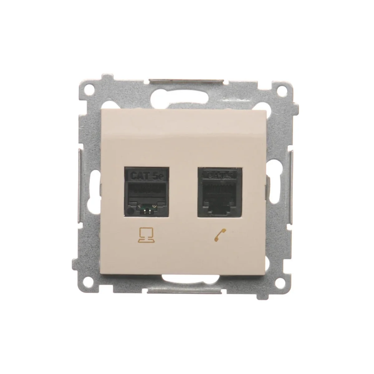 Gniazdo komputerowe RJ45 kategoria 5e + telefoniczne RJ12, z serii SIMON 54. Wykonane z tworzywa sztucznego. Z zaciskiem przebijającym izolację.