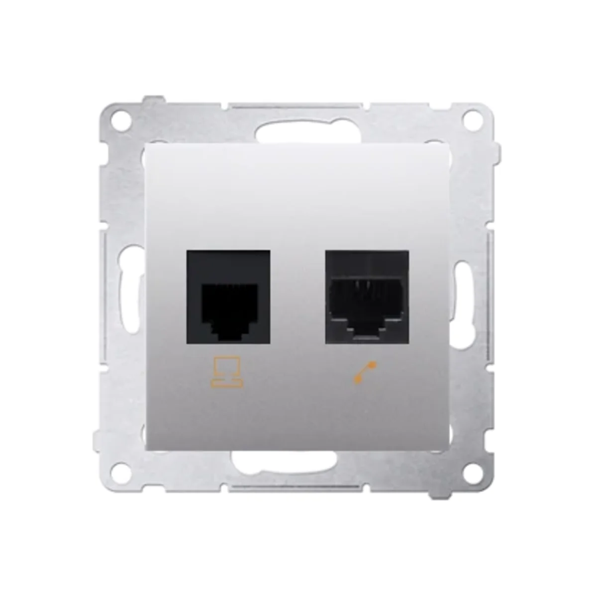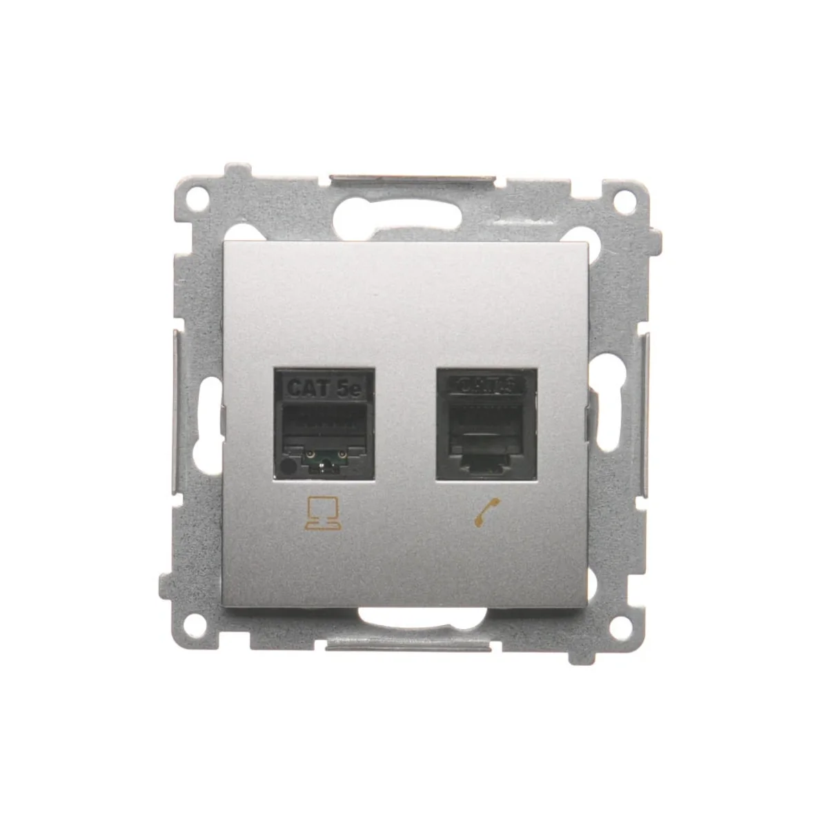 Gniazdo komputerowe RJ45 kategoria 5e + telefoniczne RJ12, z serii SIMON 54. Wykonane z tworzywa sztucznego. Z zaciskiem przebijającym izolację.