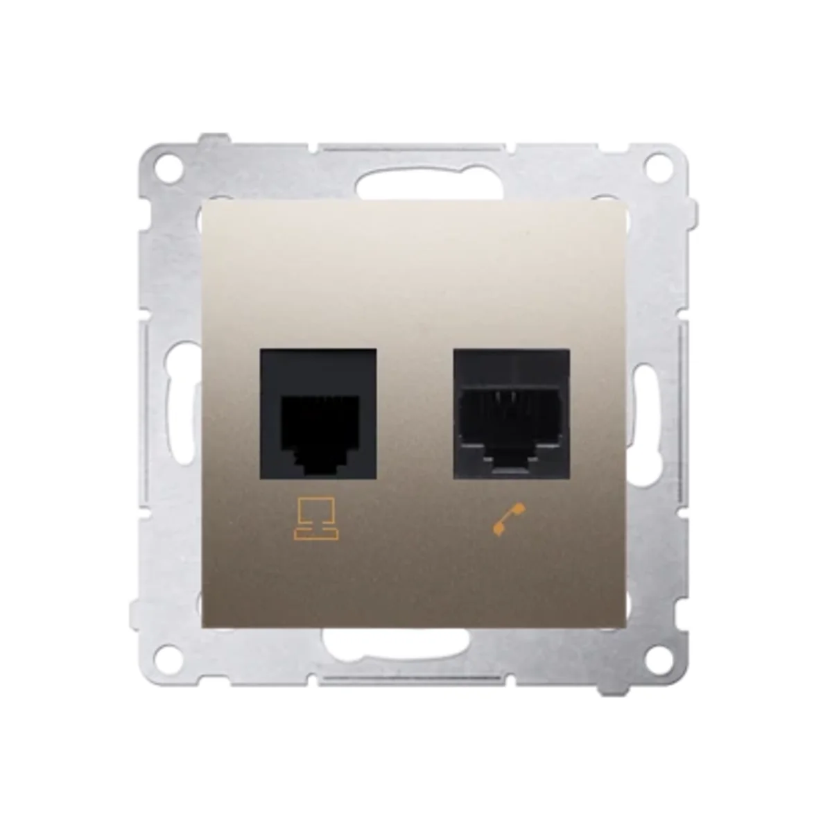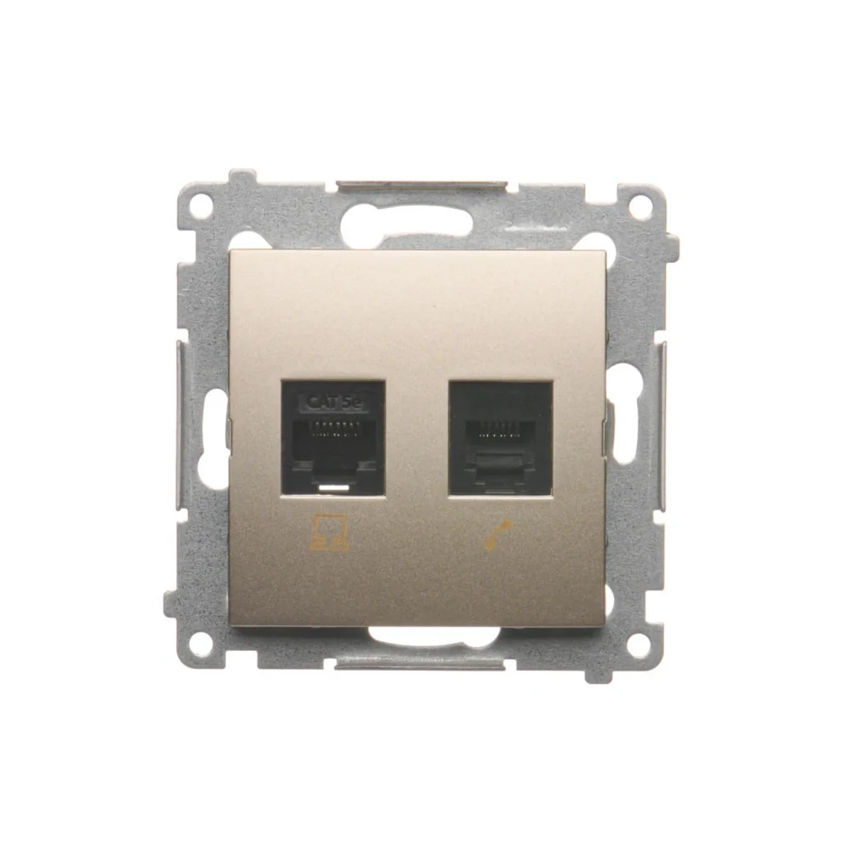 Gniazdo komputerowe RJ45 kategoria 5e + telefoniczne RJ12, z serii SIMON 54. Wykonane z tworzywa sztucznego. Z zaciskiem przebijającym izolację.