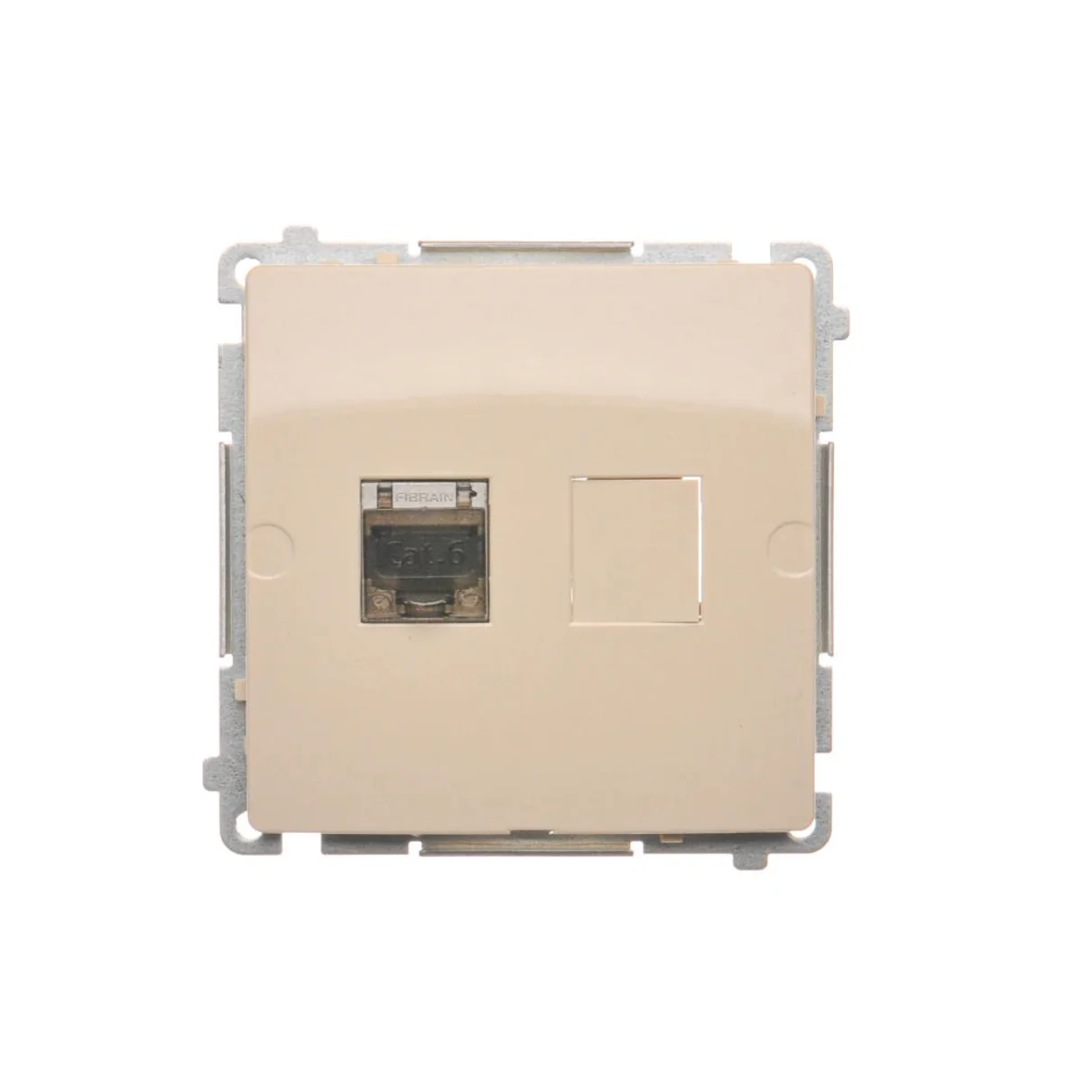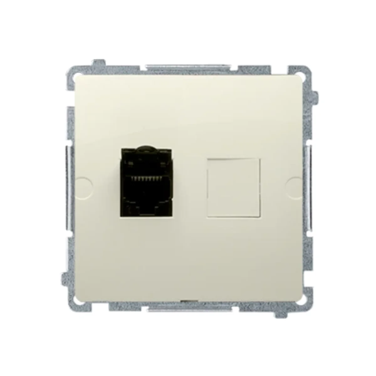 Gniazdo komputerowe pojedyncze ekranowane RJ45 kategoria 6, z przesłoną przeciwkurzową.