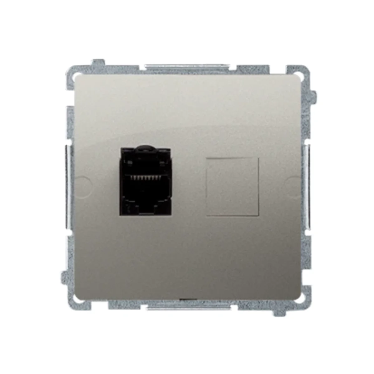 Gniazdo komputerowe pojedyncze ekranowane RJ45 kategoria 6, z przesłoną przeciwkurzową.