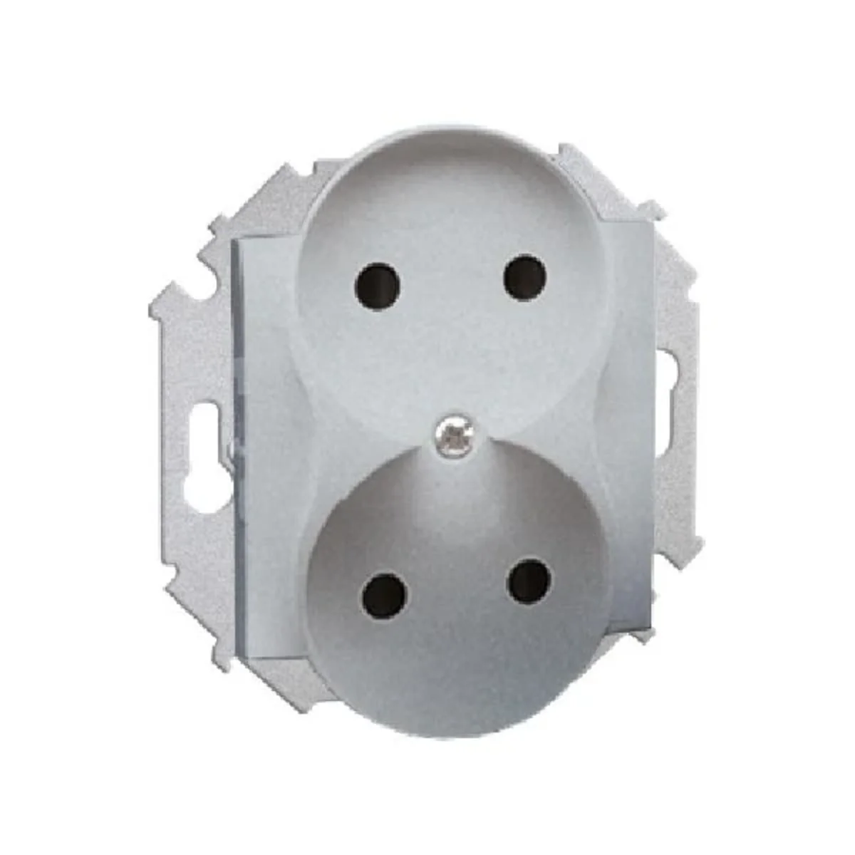 Gniazdo wtyczkowe podwójne z serii Simon 15, od producenta Kontakt Simon. Numer katalogowy produktu to 1591464-026. W kolorze aluminiowym, metalizowanym.