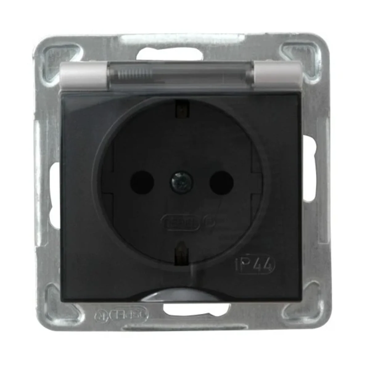 Gniazdo hermetyczne wyposażone w klapkę, z uziemieniem schuko. Należy zastosować ramkę.