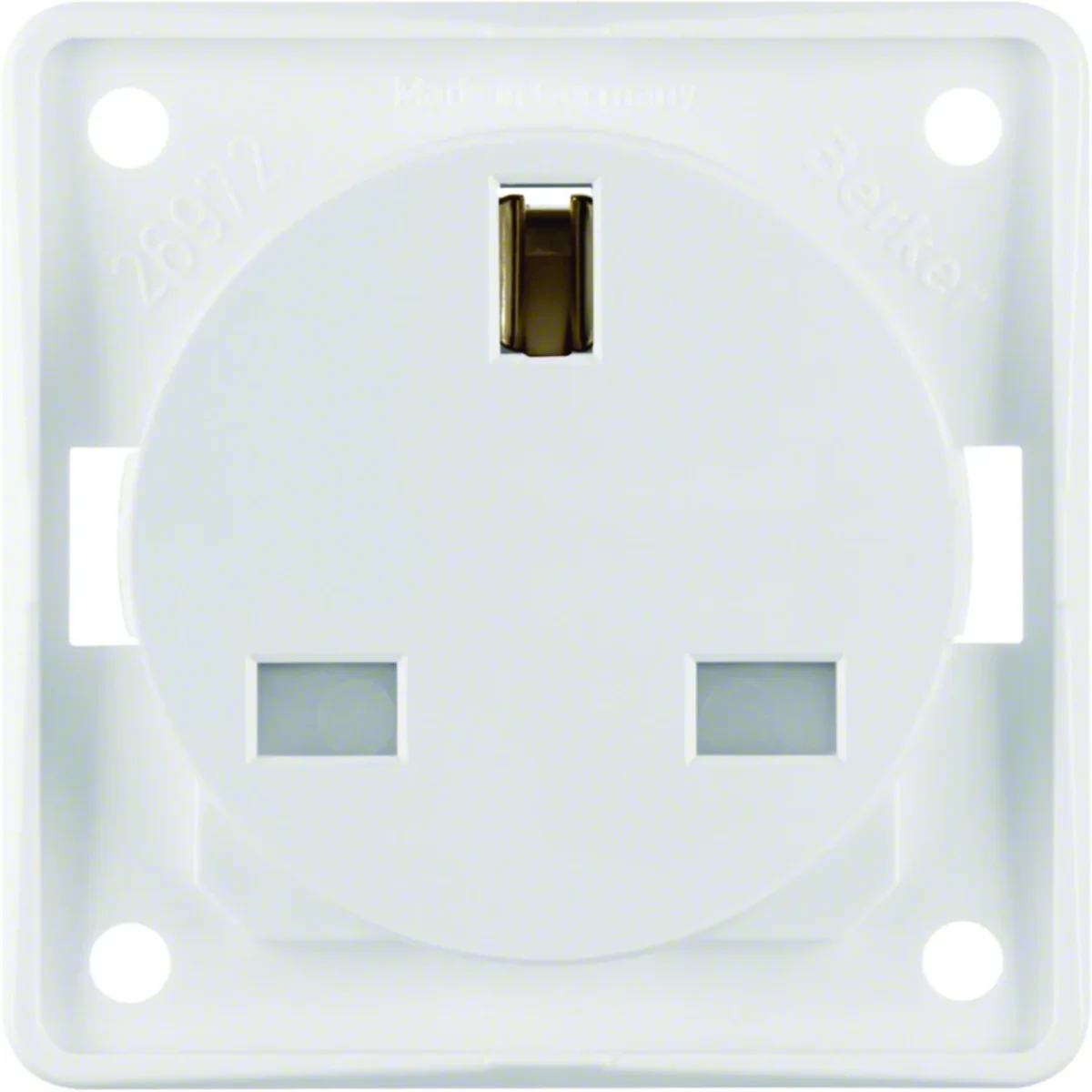Gniazdo z uziemieniem, "Standard brytyjski", z podwyższona ochroną styków, z serii Berker Integro Flow, która dzięki swemu minimalistycznemu designowi, szybkiej i łatwej instalacji stanowi idealne rozwiązanie do zastosowania w meblach kuchennych, w branży sanitarnej oraz wszędzie tam, gdzie wymagana jest kompaktowa budowa oraz wszechstronna funkcjonalność. Charakteryzuje się małymi wymiarami przystosowanymi do montażu w meblach, pojazdach technicznych, przyczepach kempingowych oraz łodziach. Główna linia projektowa: Berker Integro mechanizmy modułowe.