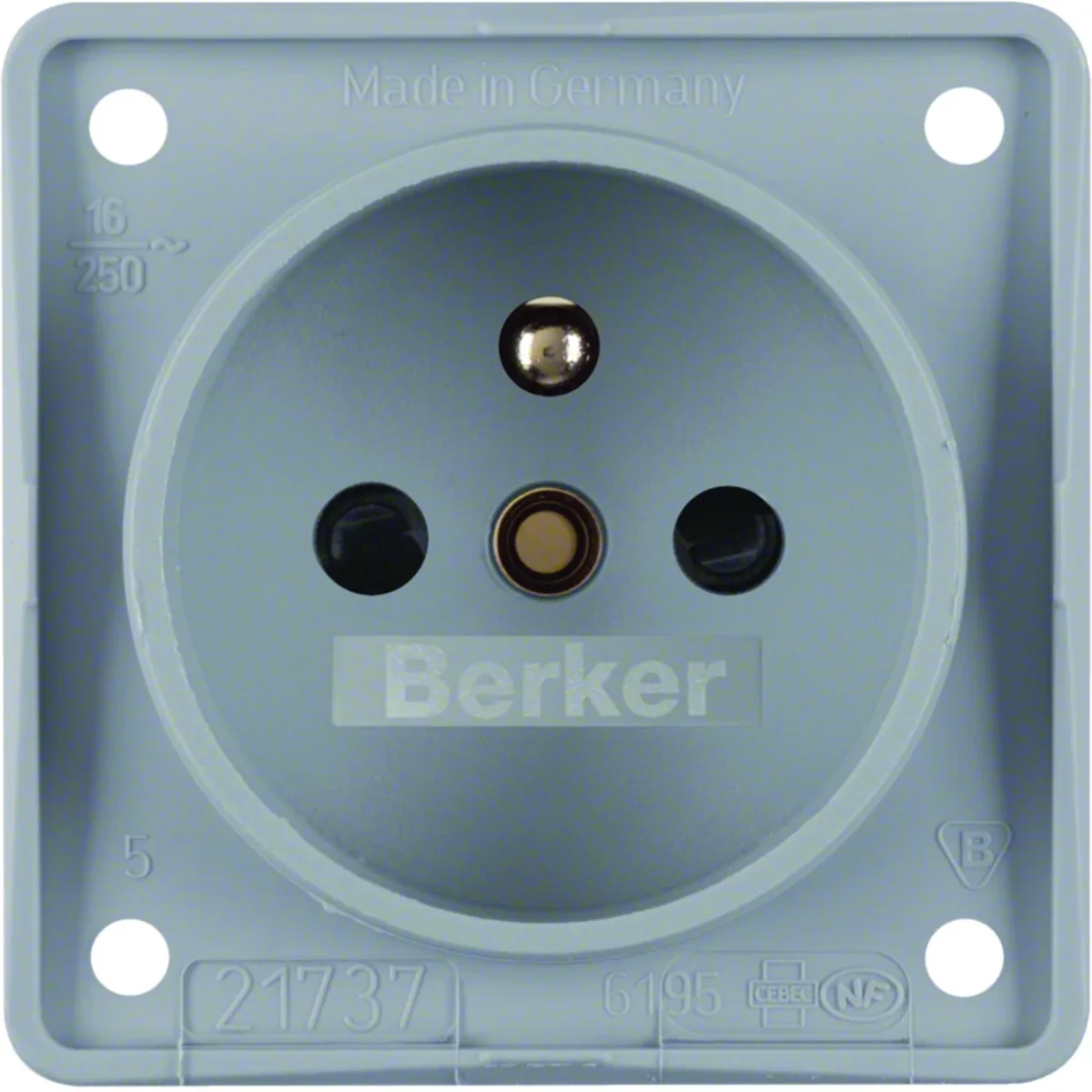 Gniazdo z uziemieniem, z podwyższoną ochroną styków, z serii Berker Integro Flow, która dzięki swemu minimalistycznemu designowi, szybkiej i łatwej instalacji stanowi idealne rozwiązanie do zastosowania w meblach kuchennych, w branży sanitarnej oraz wszędzie tam, gdzie wymagana jest kompaktowa budowa oraz wszechstronna funkcjonalność. Charakteryzuje się małymi wymiarami przystosowanymi do montażu w meblach, pojazdach technicznych, przyczepach kempingowych oraz łodziach. Główna linia projektowa: Berker Integro mechanizmy modułowe.