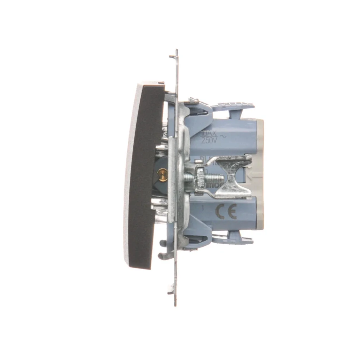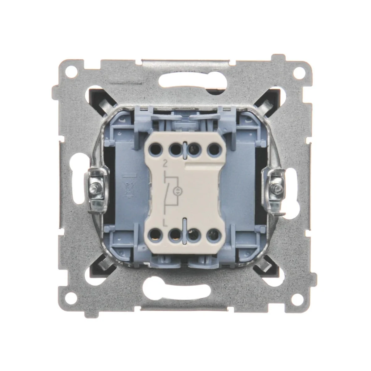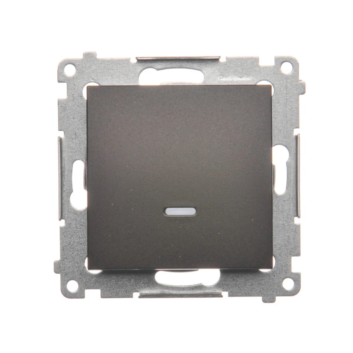Łącznik jednobiegunowy (bistabilny) z serii Simon 54. Z orientującym podświetleniem LED wymienialnym, w kolorze niebieskim. Do uzyskania klasy bryzgoszczelności IP44 zastosować uszczelkę ramki.