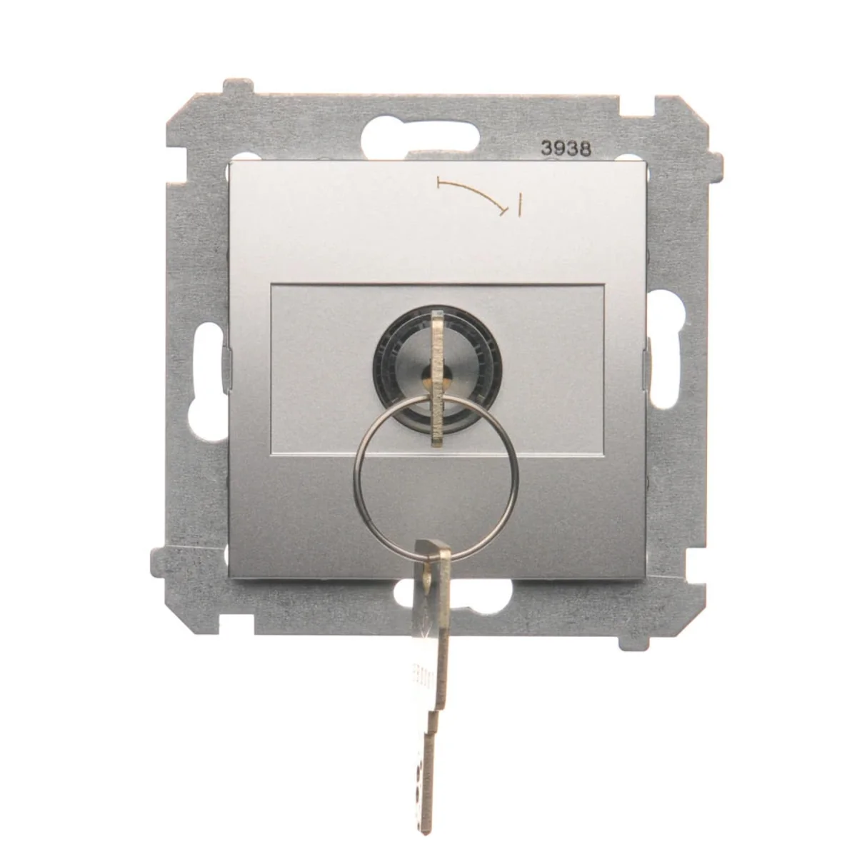 Łącznik na kluczyk chwilowy (przycisk) z serii Simon 54, od producenta Kontakt Simon. Numer katalogowy produktu to DP1K.01/43. W kolorze srebrny mat, metalizowany.