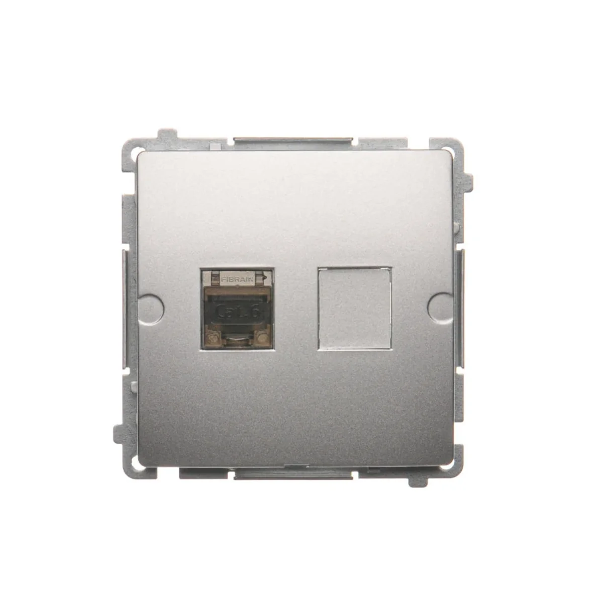 SIMON BASIC Gniazdo komputerowe pojedyncze ekranowane RJ45 kategoria 6 z przesłoną przeciwkurzową (moduł) srebrny mat metalizowany BM61E.01/43