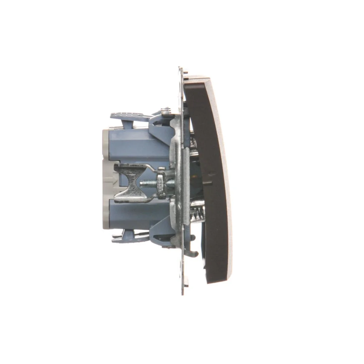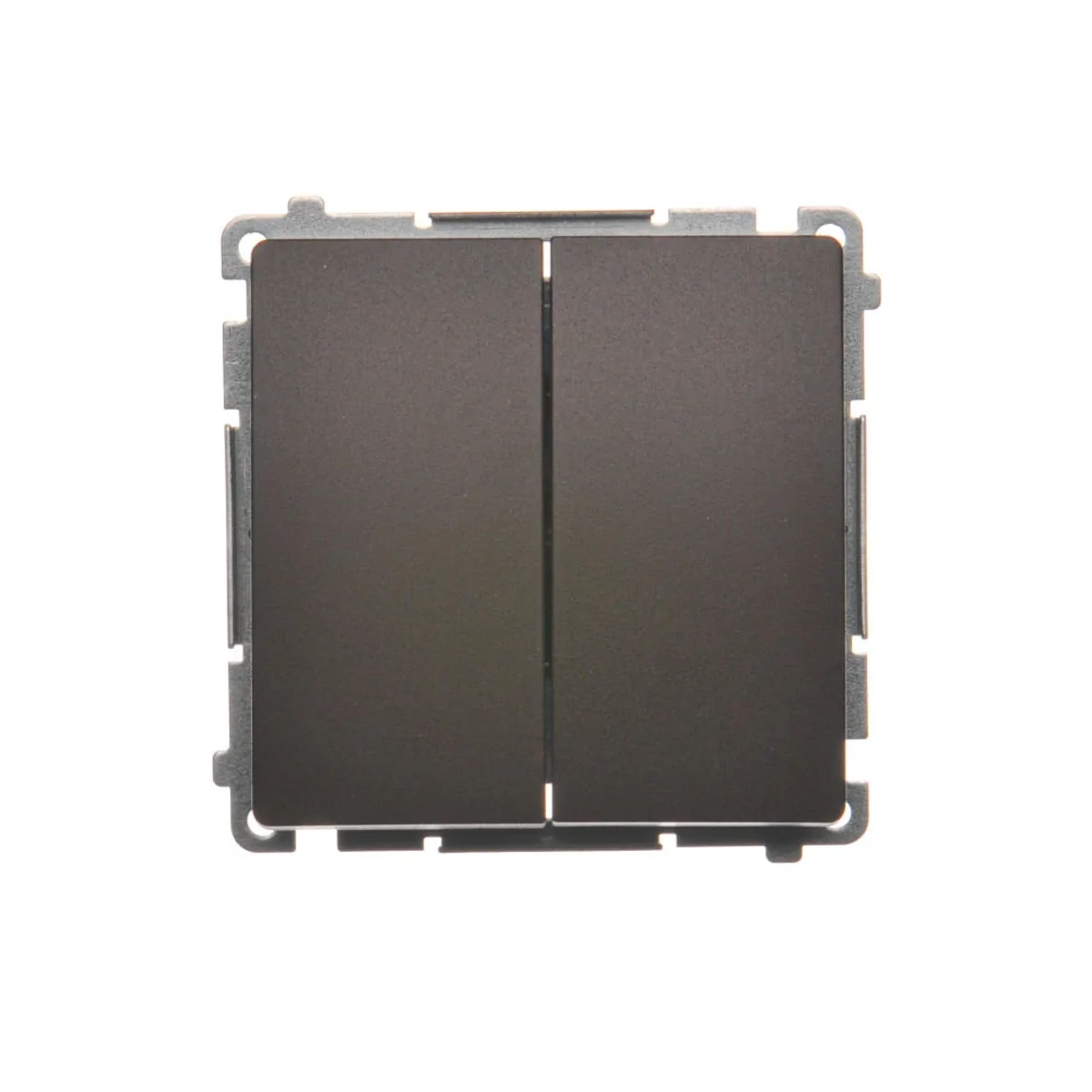 Przycisk zwierny podwójny z serii Simon Basic, od producenta Kontakt Simon. Numer katalogowy produktu to BMP2.01/47. W kolorze czekoladowy mat, metalizowany.