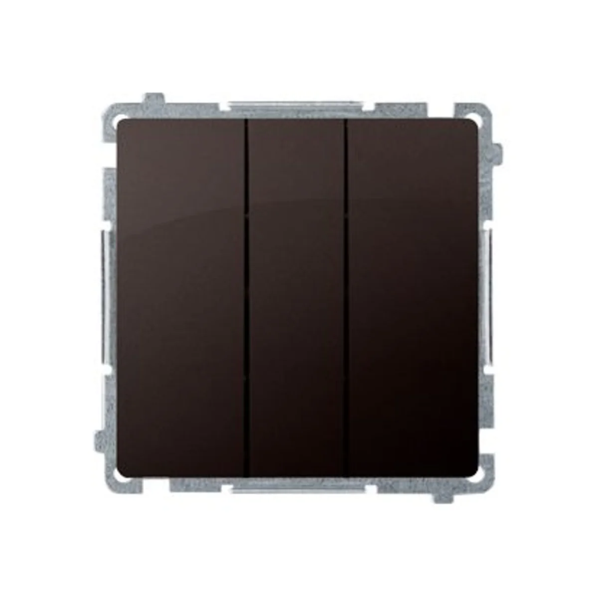Przycisk potrójny z podświetleniem, z serii Simon Basic, od producenta Kontakt Simon. Numer katalogowy produktu to BMP31L.01/47. W kolorze czekoladowy mat, metalizowanym.