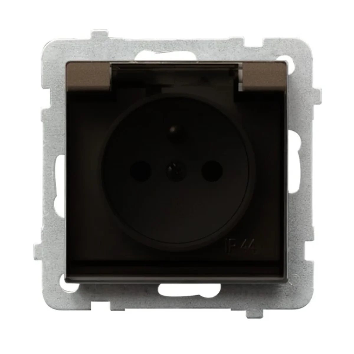 SONATA Gniazdo bryzgoszczelne z uziemieniem czekoladowy metal, bez ramki, wieczko przeźroczyste GPH-1RZ/M/40/D