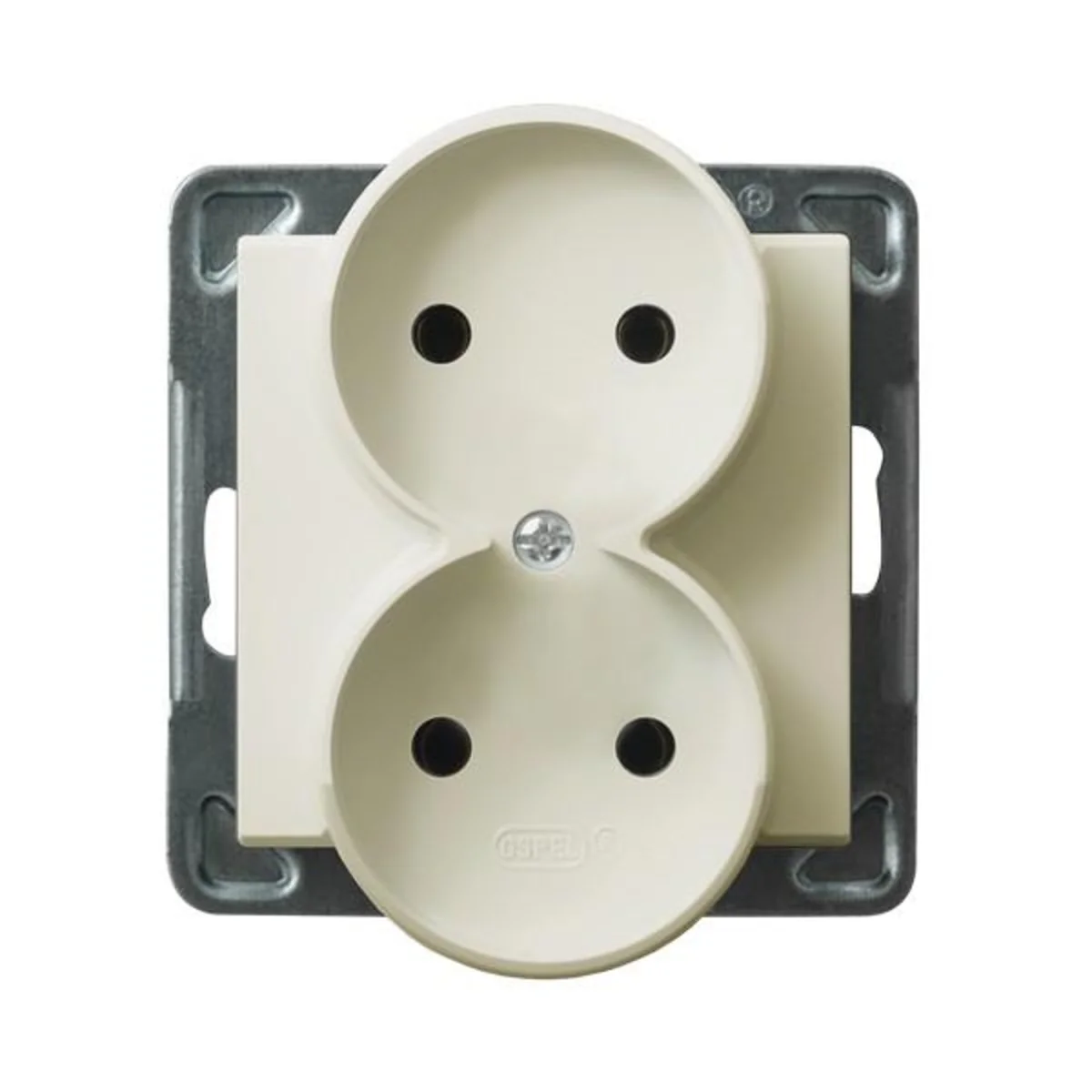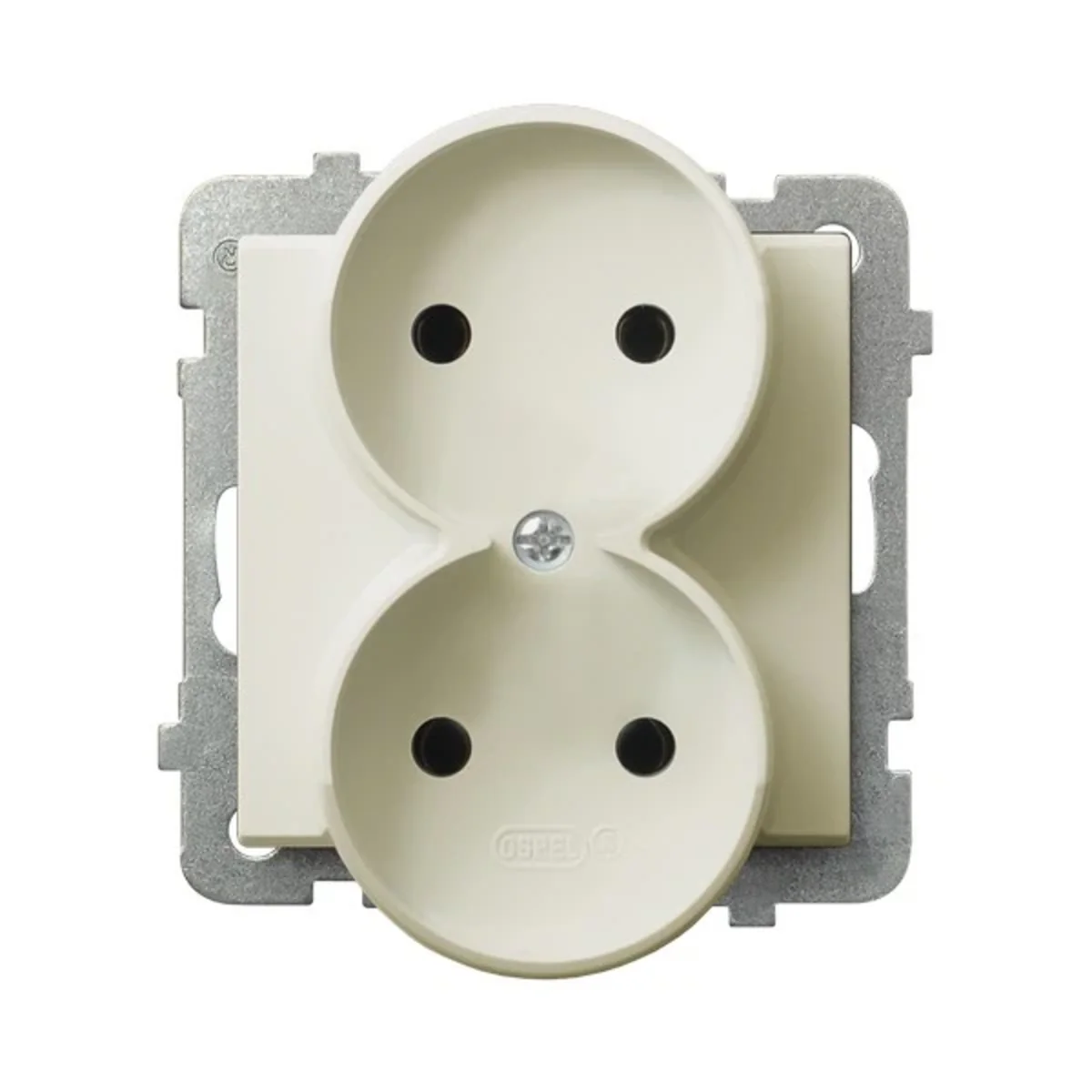 Gniazdo elektryczne podwójne, bez uziemienia, do wyposażenia w ramkę.