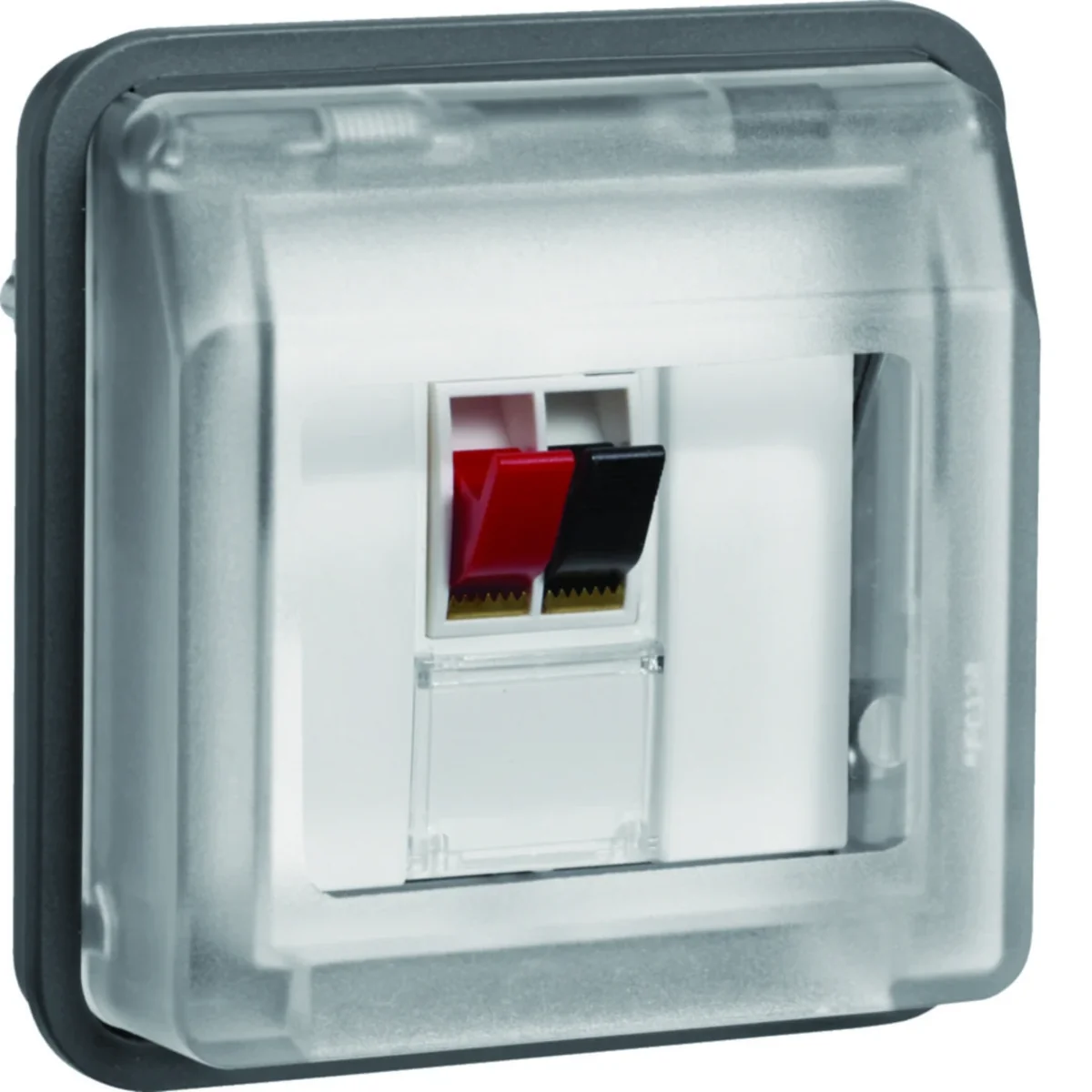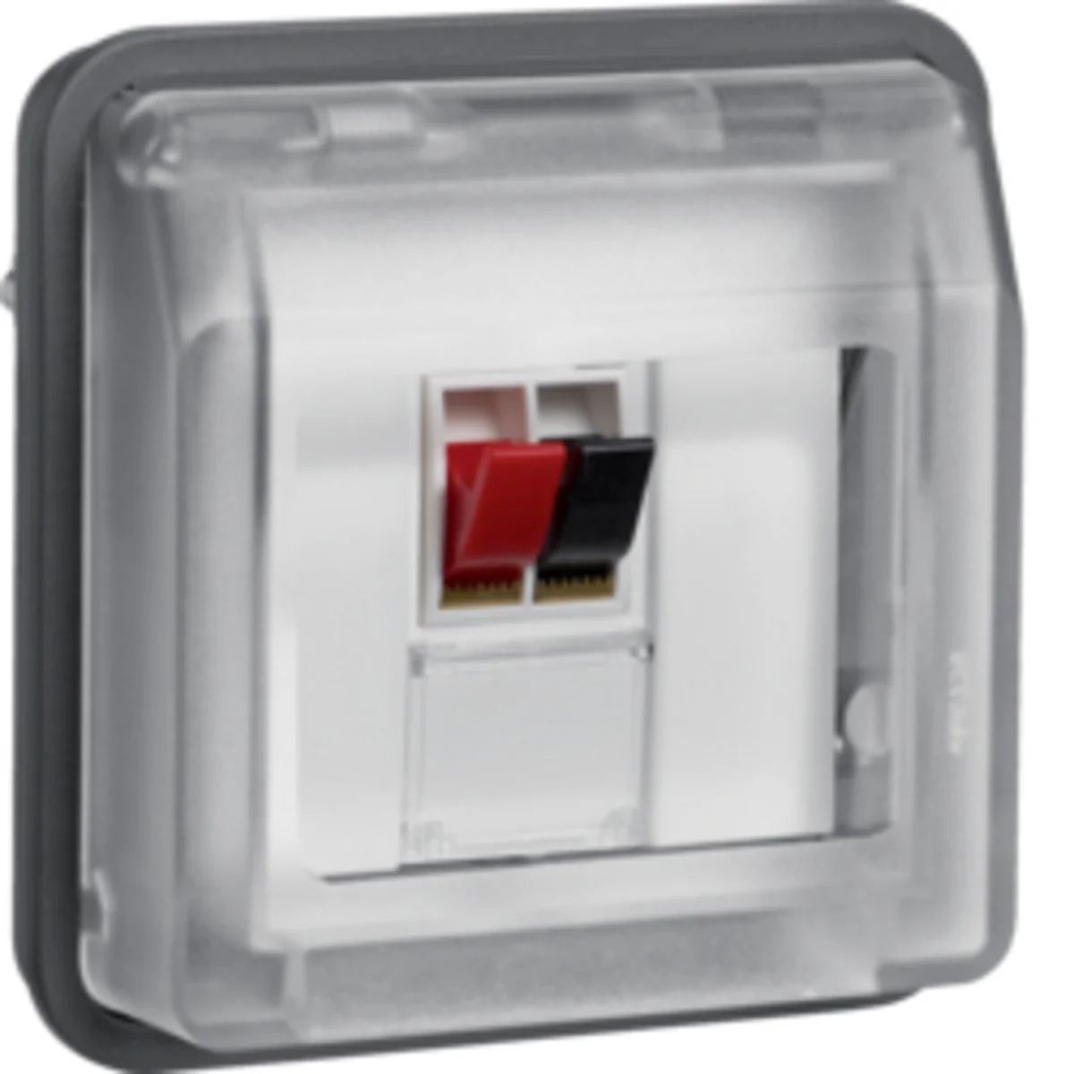 Berker W.1 to seria wodoodpornego osprzętu elektroinstalacyjnego, która wyróżnia się innowacyjnym wyglądem. Gniazdo głośnikowe charakteryzują cechy tej serii.