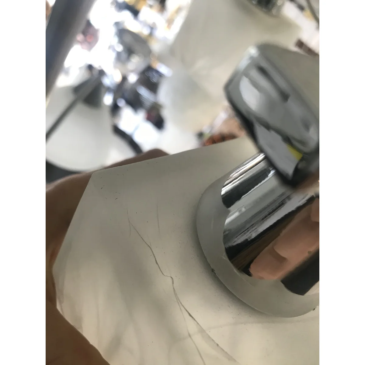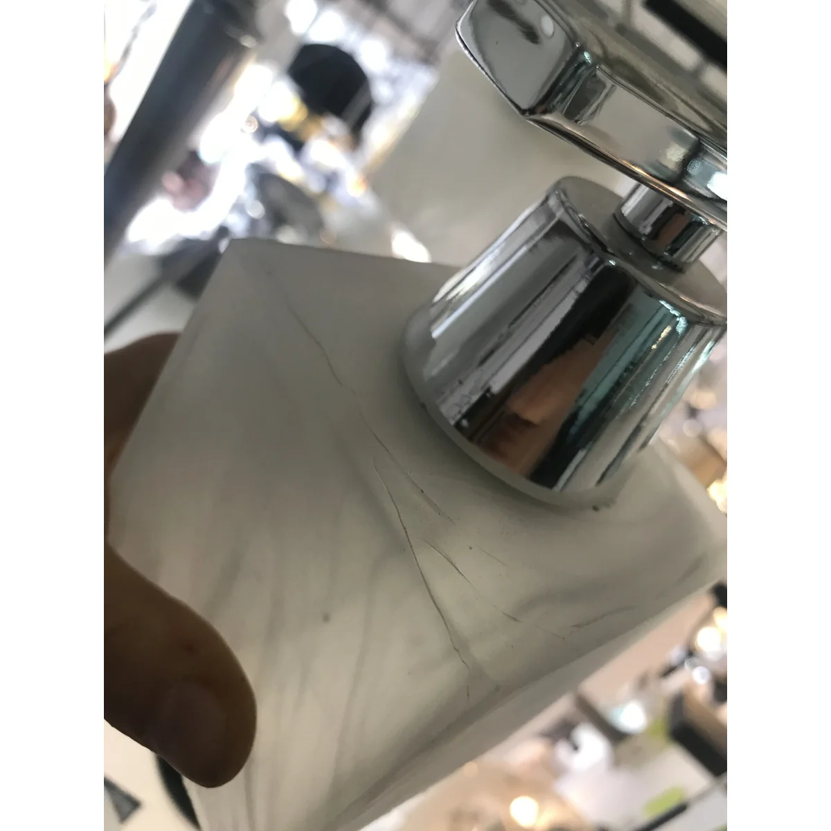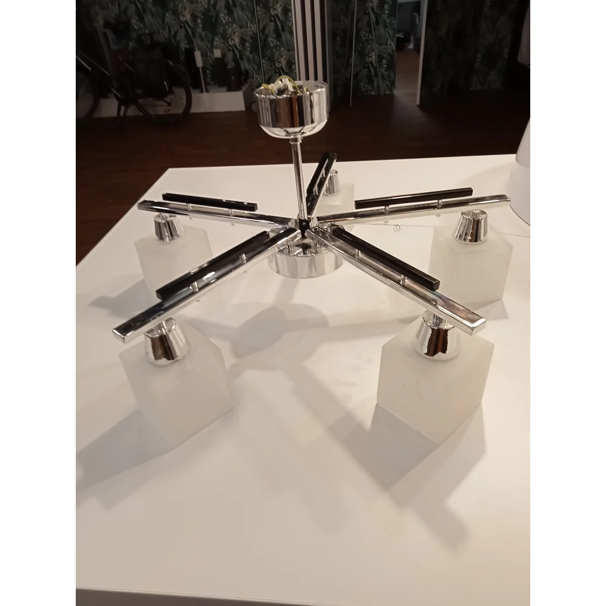 Lampa pochodzi z ekspozycji. Lampa posida nadpęknięty klosz (w górnej części), ale ze wględu na jego grubość nie spowodowało to uszkodzenia. Patrząc na lampe od dołu nie jest ono widoczne.