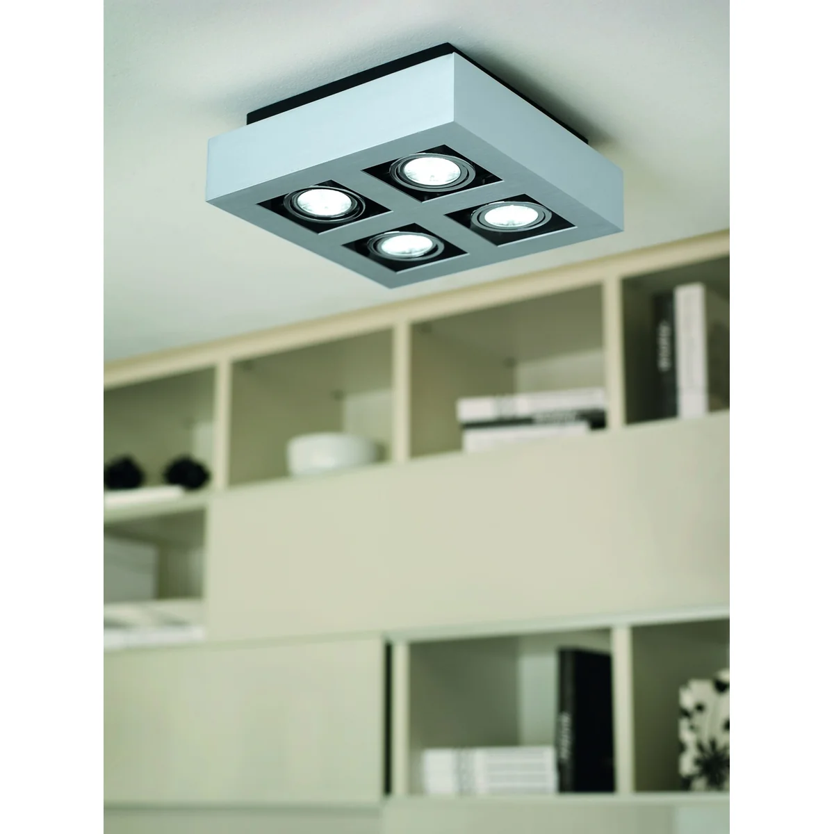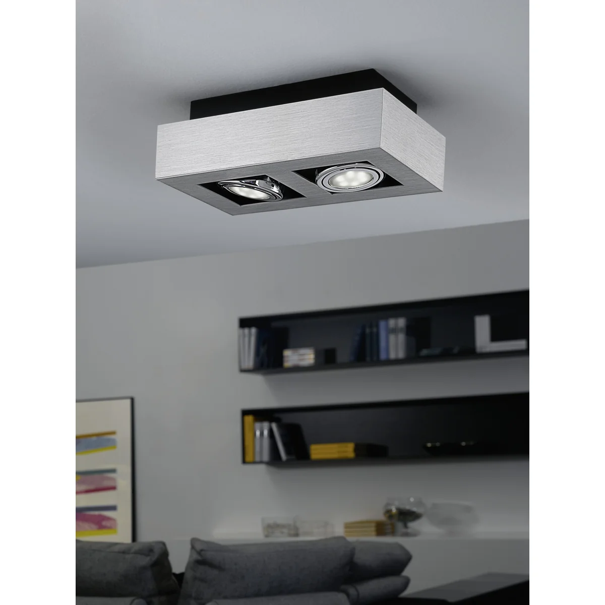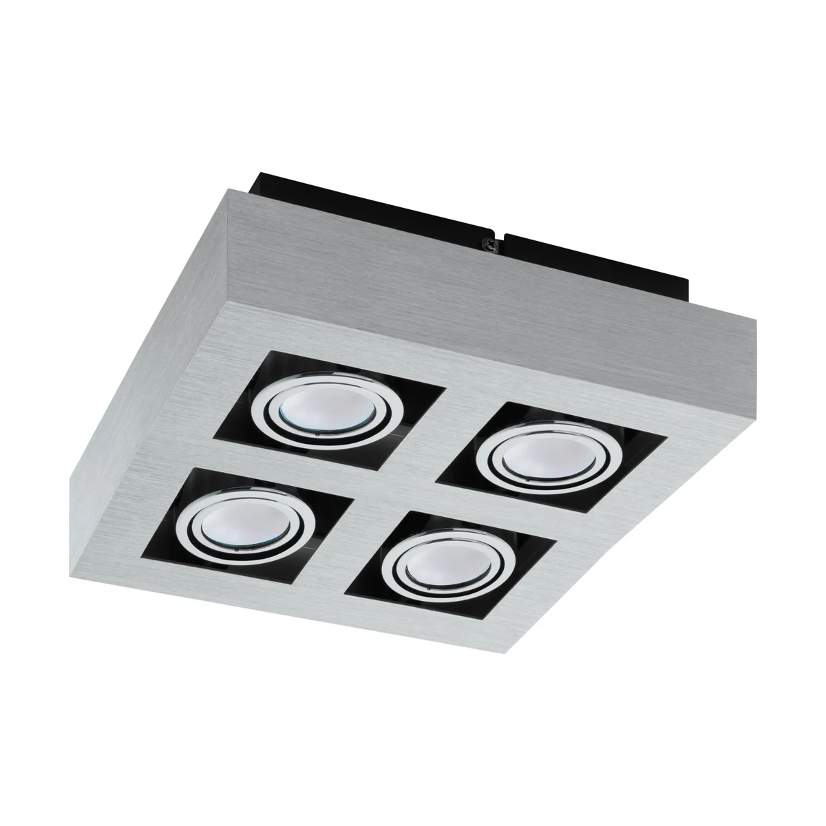 Oprawa do nabudowania z serii LOKE 1 wykonana jest ze szczotkowanego aluminium oraz chromowanej i czarnej stali. Wyposażony jest w cztery lampy GU10-LED zapewniające ciepłe, białe światło.