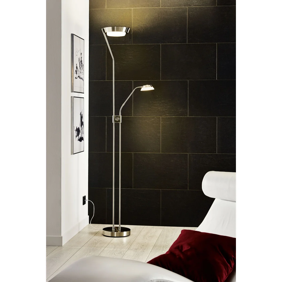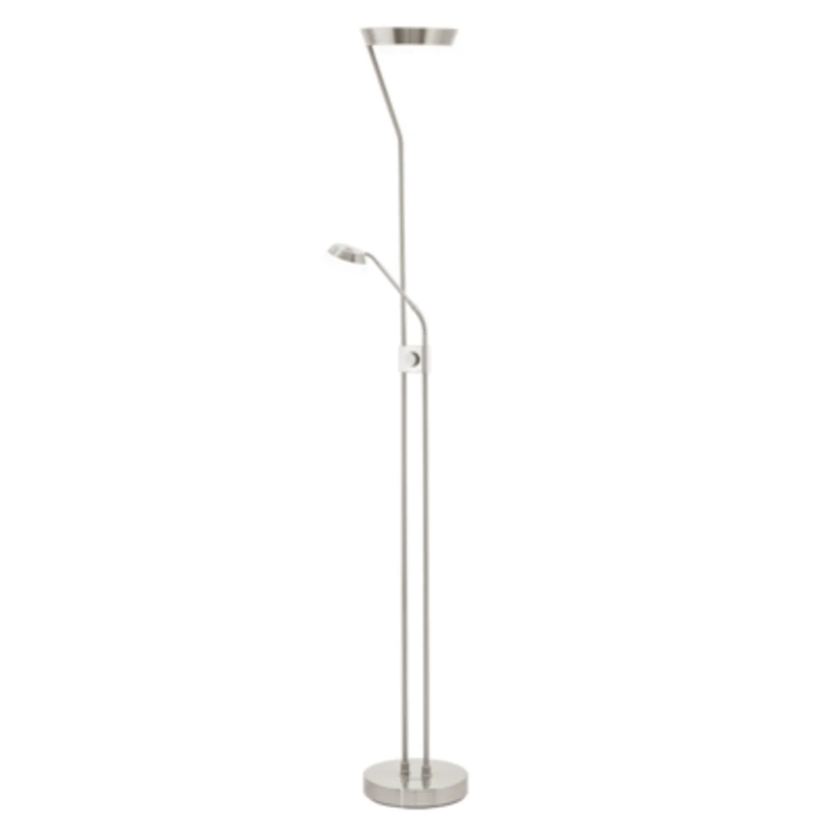 Podłogowa oprawa z serii SARRIONE wykonana jest ze stali satynowo-niklowej oraz satynowanego tworzywa sztucznego i jest sterowana przyciskiem kołyskowym. Posiada wewnętrzny ściemniacz i izolację ochronną. Wyposażony jest w trzy lampy LED zapewniające ciepłe, białe światło.