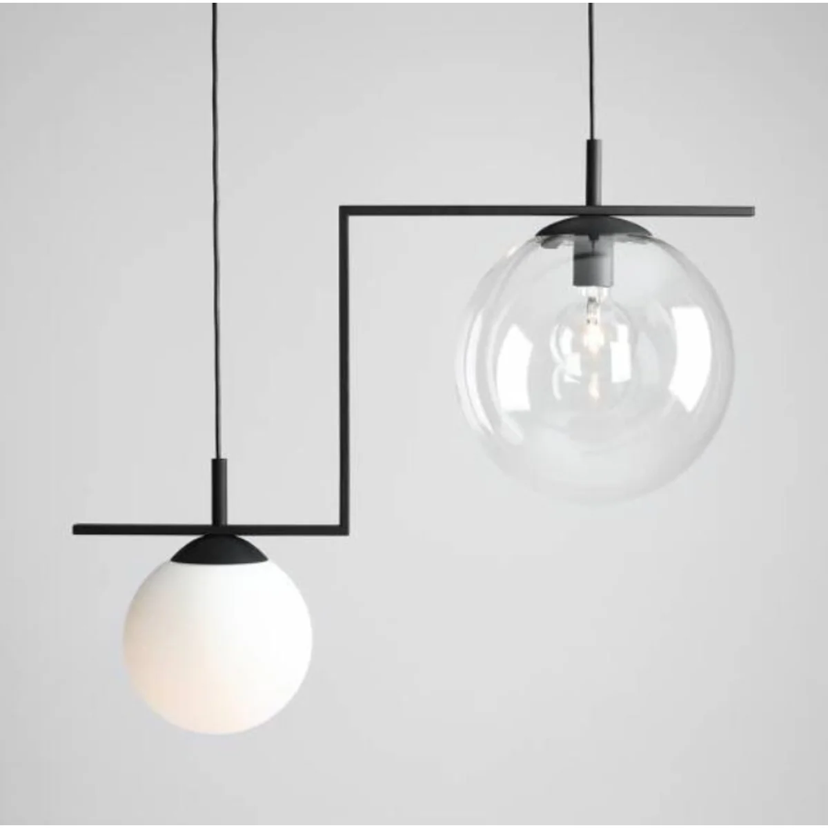 Geometryczna lampa wisząca Zac z dwiema kulami 30cm i 20cm, z których jedna wykończona jest białym matem a druga przeroczysta. Lampa występuje w dwóch wybarwieniach: białym i czarnym.