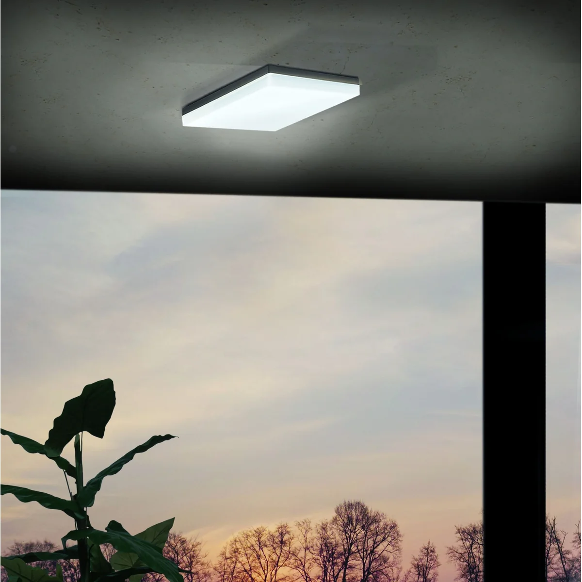 Zewnętrzna lampa ścienno sufitowa z serii SONELLA. Podstawa i klosz wykonane są z tworzywa sztucznego. Obudowa w kolorze antracyt, klosz biały. Źródło światła LED o mocy 8,2W emituje ciepłe, białe światło. Długość / szerokość wynosi 21,5 cm, wysokość 7 cm. Lampa posiada izolację ochronną i oraz stopień ochrony IP44.