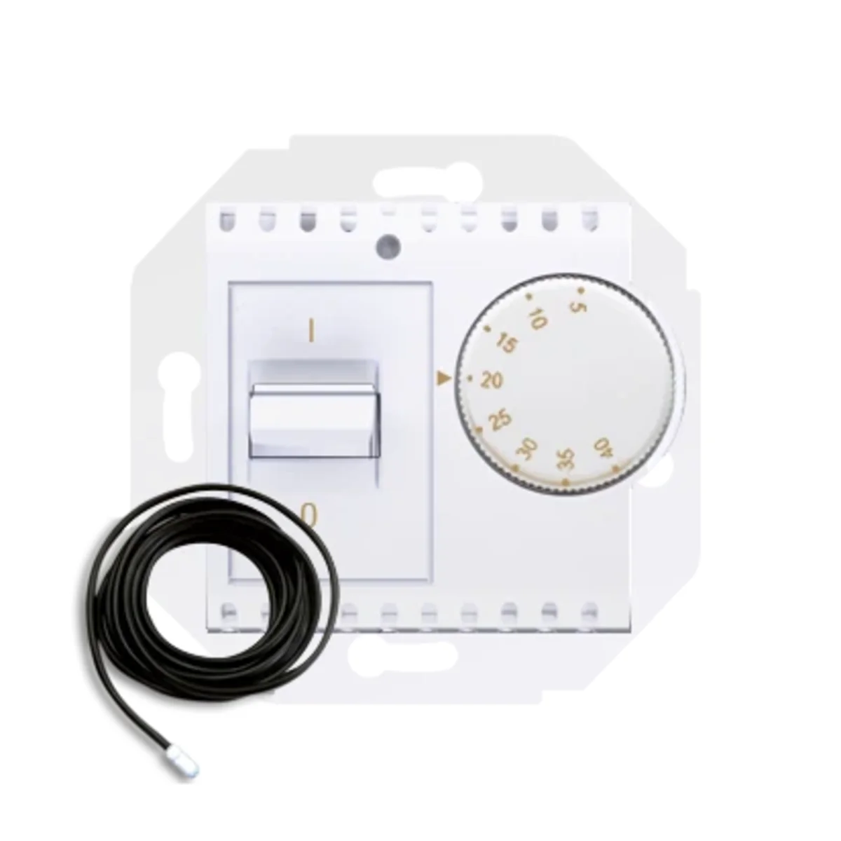 Regulator temperatury z czujnikiem zewnętrznym w komplecie z sondą (moduł), 16(2) A, 230 V, w komplecie czujnik zewnętrzny (sonda). Montaż na wkręty.
