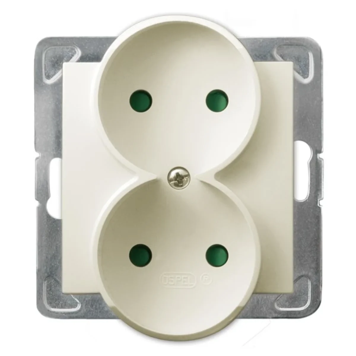 Gniazdo elektryczne podwójne, z przesłonami torów prądowych, do wyposażenia w ramkę.