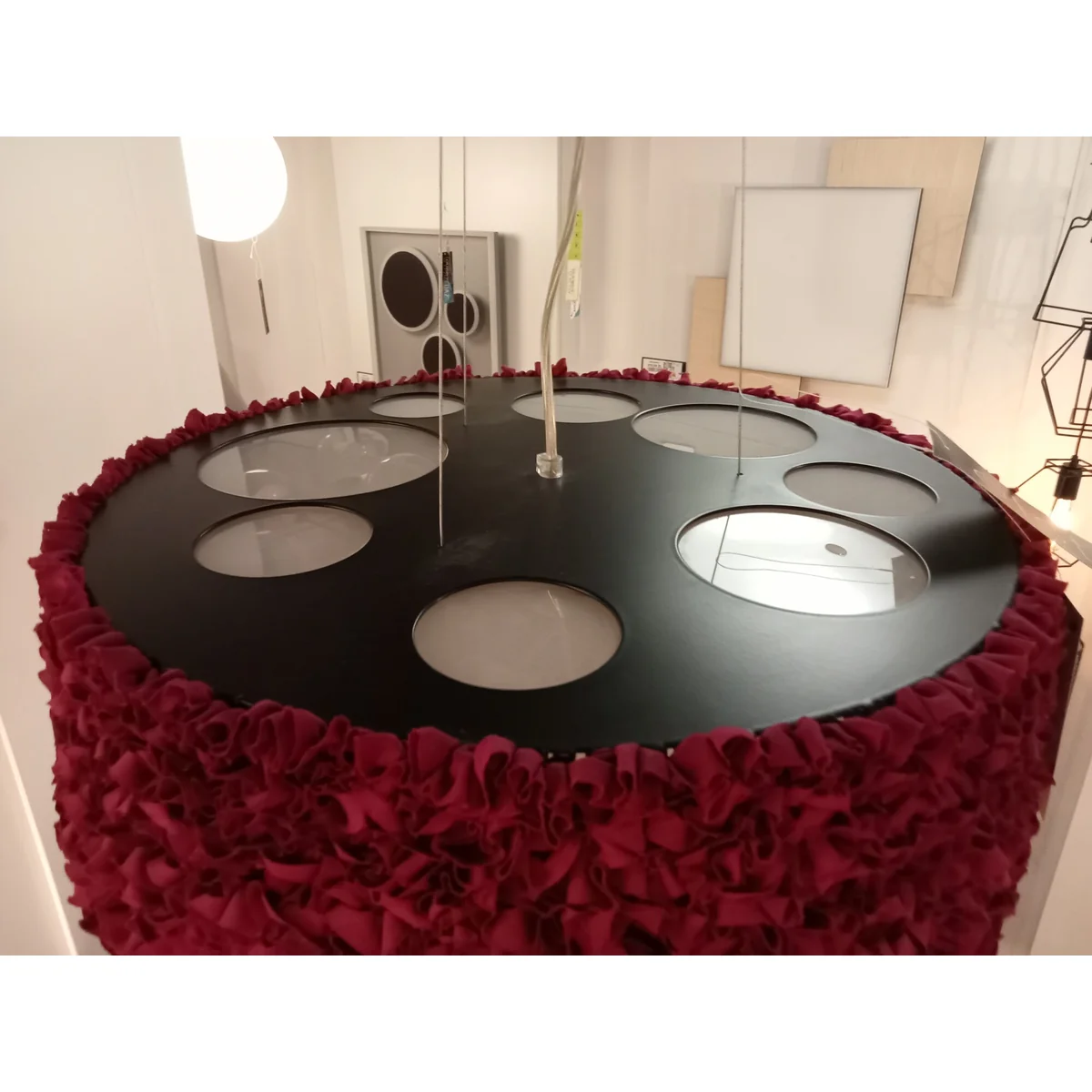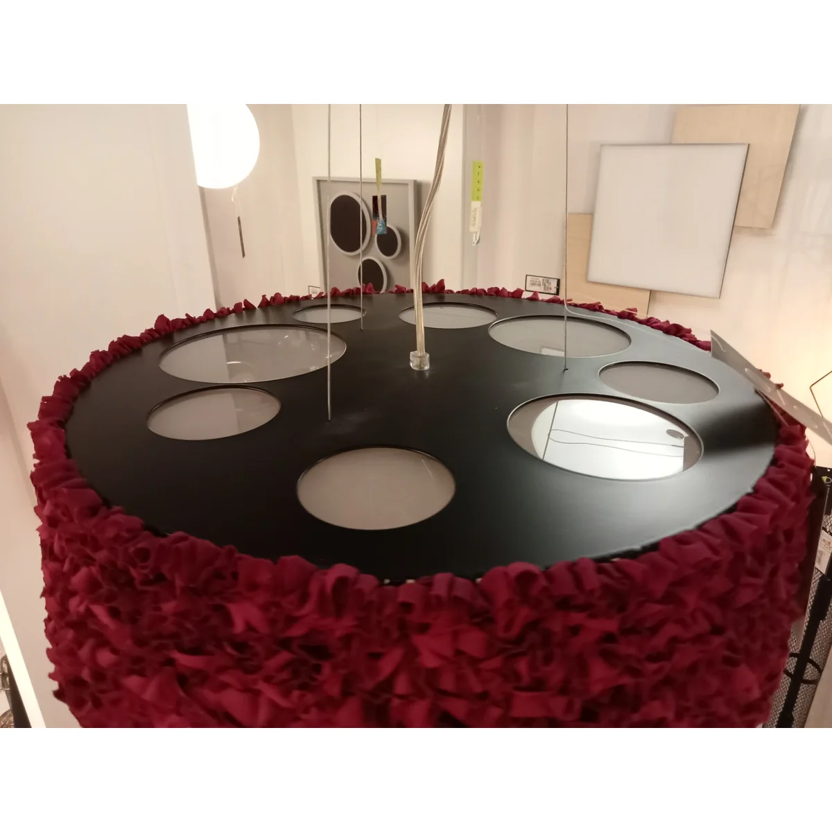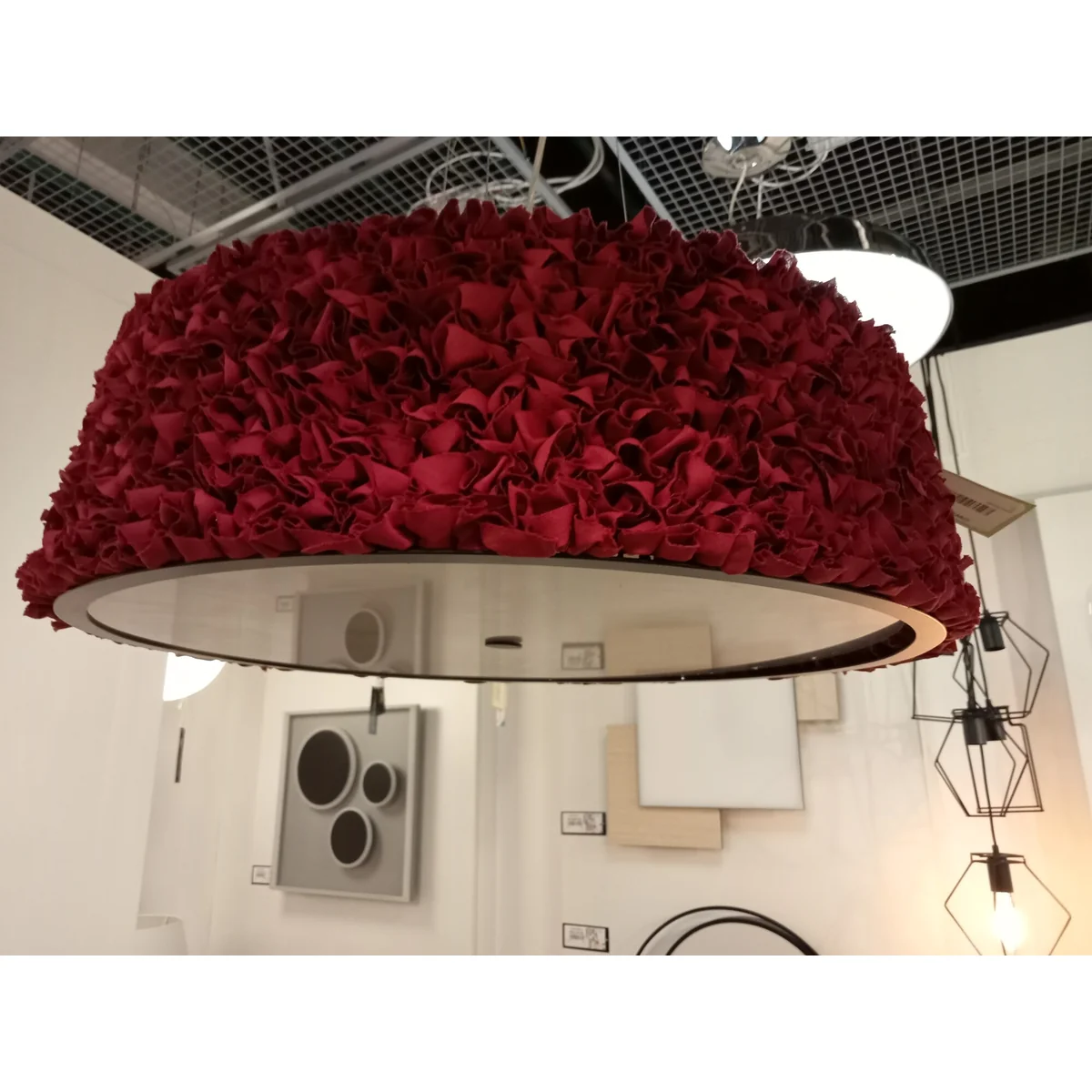 Lampa wisząca MIUU w bordowym odcieniu wykonana jest z metalu, tkaniny i tworzywa sztucznego . Oprawa doskonale sprawdzi się w salonie, przestrzeniach hotelowo-restauracyjnych oraz jadalni wprowadając wyjątkowy akcent aranżacyjny.