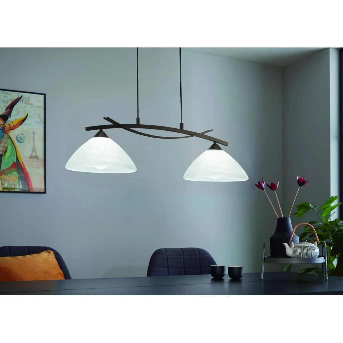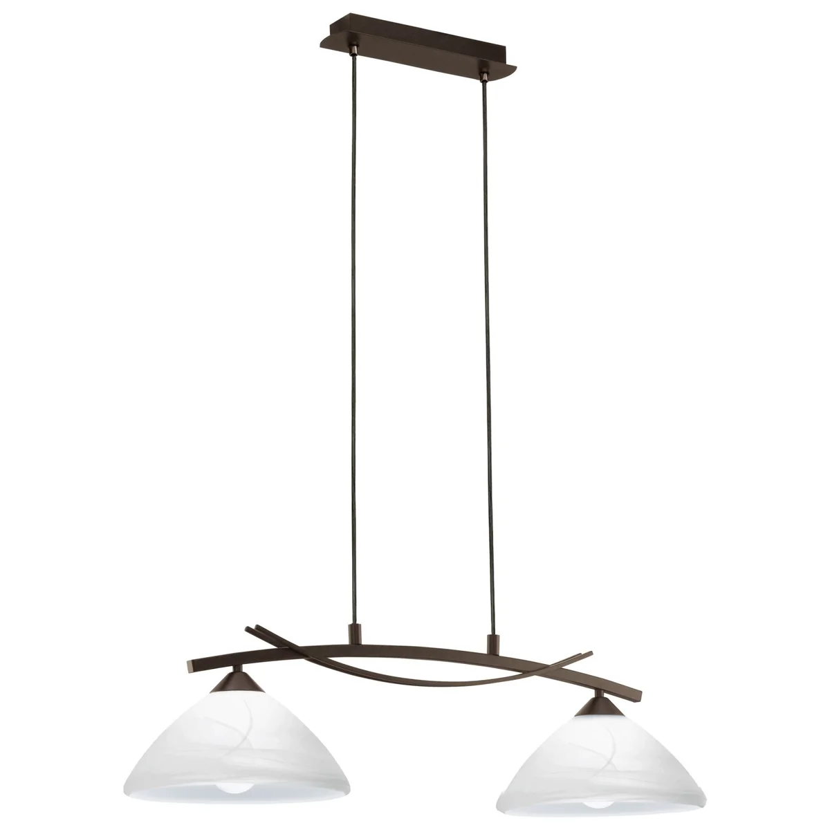Zwieszana oprawa VINOVO wykonana jest z ciemnobrązowej stali i białego alabastrowego szkła.